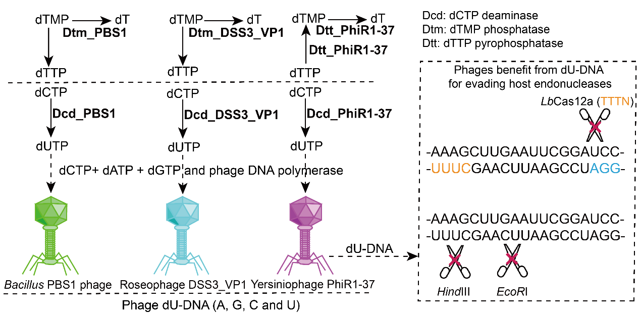 噬菌体非经典DNA的研究有助于揭示核酸演化、生命起源等重要科学问题。DNA的碱基修饰是噬菌体逃避宿主免疫防御的重要策略,一个有趣的发现是PBS1、DSS3_VP1和PhiR1-37等噬菌体中存在的dU-DNA,这种特殊的DNA中dT被dU完全取代。本研究利用生物信息学、结构生物学、生物化学等多种手段挖掘并表征了噬菌体dU-DNA生物合成的多个关键酶包括dCTP脱氨酶(参与dUTP的生物合成)、dTTP焦磷酸水解酶和dTMP磷酸水解酶(负责dTTP的降解)。进一步的体外酶切实验表明dU-DNA可以逃避宿主限制性内切酶的切割,PCR扩增的dU-DNA展现出了对Cas12a的耐受性。PBS1噬菌体dCTP脱氨酶的系统发育分析表明其同源相关的T4噬菌体dCMP脱氨酶都可能起源于细菌dCDP脱氨酶。该研究发现了噬菌体多样化的核苷酸代谢新机制,丰富了噬菌体与细菌之间免疫防御分子机制的认识。