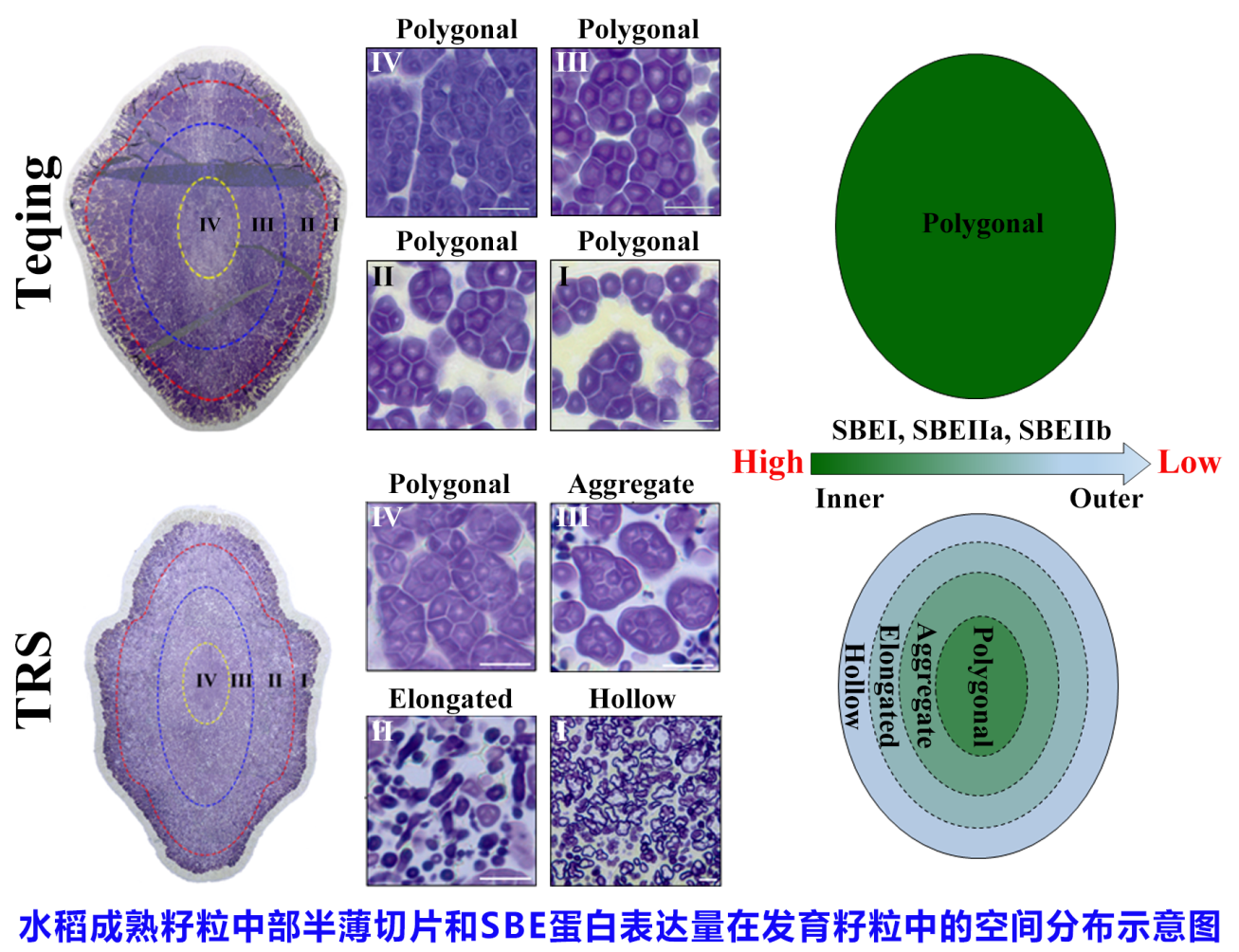 当淀粉分支酶(starch branching enzyme, SBE)的表达受到抑制后,谷类作物胚乳中的直链淀粉和抗性淀粉含量显著升高,并具有明显促进人体健康的功能。但伴随直链淀粉含量的升高,胚乳开始形成不同形态的淀粉粒(异形淀粉),并且这种现象在其它淀粉合成相关酶的缺失或突变体中也存在,暗示从胚乳内部到外部,淀粉粒有着不同的合成和调控机制。但有关异形淀粉粒形态建成的机制知之甚少。