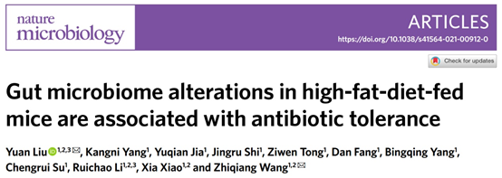 5月20日,实验室王志强教授研究团队在顶级期刊《Nature Microbiology》发表了题为《Gut microbiome alterations in high-fat-diet-fed mice are associated with antibiotic tolerance》的研究论文。