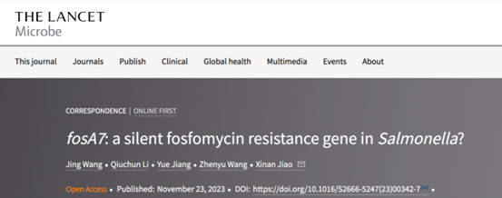 焦新安教授团队于2023年11月23日在《Lancet Microbe》杂志在线发表题为“fosA7: a silent fosfomycin resistance gene inSalmonella?” (Doi: 10.1016/S2666-5247(23)00342-7)的简讯,揭示fosA7作为沉默的磷霉素耐药基因在沙门菌中广泛流行。