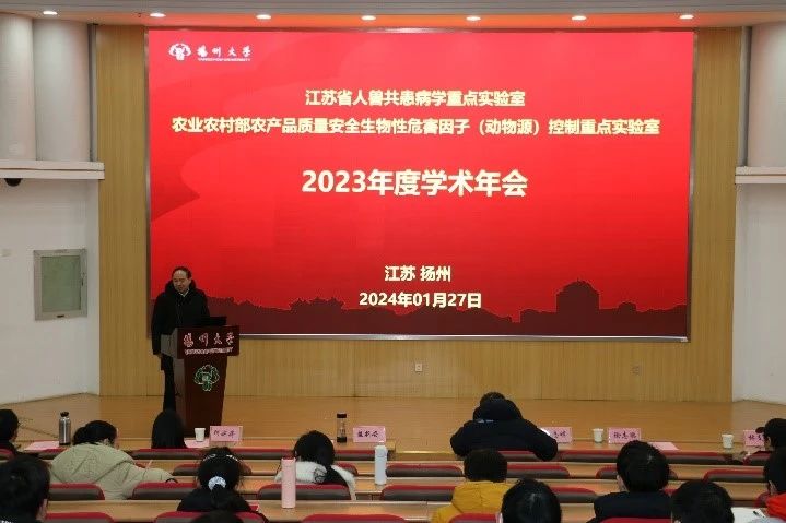 2024年1月27日,江苏省人兽共患病学重点实验室/农业部农产品质量安全生物性危害因子(动物源)控制重点实验室2023年度学术会议在扬州大学荷花池校区图书馆报告厅顺利召开。实验室主任焦新安教授致辞,副主任陈祥教授主持会议,实验室师生150余人参加会议。会议邀请了来自扬州大学数学科学学院林支桂教授、扬州大学医学院张评浒教授、中国药科大学药学院何婉婷教授以及南京医科大学基础医学院徐志鹏教授等相关领域专家学者进行学术报告。