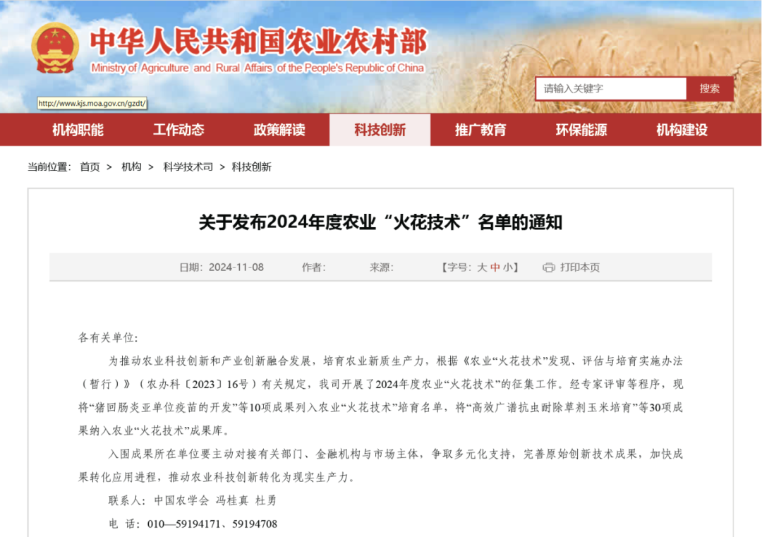 近日,农业农村部科学技术司发布2024年度农业“火花技术”名单,共有10项成果入选培育名单、30项成果入选成果库。