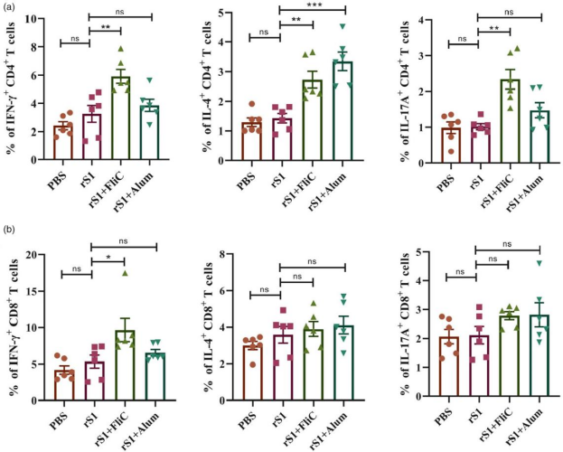 通过流式细胞术对细胞因子分泌的CD4+和CD8+ T细胞进行定量分析。与仅使用rS1免疫相比,rS1联合鞭毛蛋白FliC进行免疫接种,使得分泌IFN-γ和IL-4的CD4+ T细胞的比例更高,同时分泌IL-17A的CD4+ T细胞的表达量也有所增加。然而,在rS1 + Alum组中,只有分泌IL-4的CD4+ T细胞显著增加(图5a)。在rS1+FliC组中,观察到抗原特异性的分泌IFN-γ的CD8+ T细胞的比例显著增加。各组之间分泌IL-4的CD8+ T细胞和分泌IL-17A的CD8+ T细胞的比例没有显著差异(图5b)。