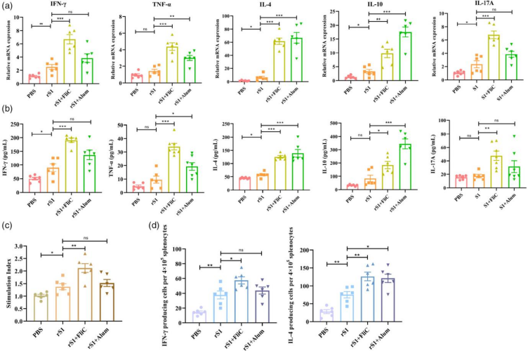 在第三次接种2周后,研究团队采集小鼠脾脏,通过细胞增殖和细胞因子表达分析来评估疫苗诱导的细胞免疫应答。qRT-PCR检测结果显示,与PBS组相比,rS1组小鼠体内Th1细胞因子(IFN-γ)、Th2细胞因子(IL-4和IL-10)以及Th17细胞因子(IL-17A)的mRNA表达水平显著增加。当rS1与Alum联合使用时,TNF-α、IL-4和IL-10的表达水平显著升高,而IFN-γ和IL-17A的表达无显著差异。当rS1与FliC联合使用时,IFN-γ、TNF-α、IL-4、IL-10和IL-17A的表达均显著高于rS1单独组(图4a)。此外,通过ELISA检测脾细胞在rS1蛋白刺激两天后的细胞因子分泌水平,得到了与qRT-PCR分析一致的结果(图4b)。同时,rS1 + FliC组的脾淋巴细胞增殖水平显著高于rS1 + Alum组(图4c)。ELISpot结果显示rS1组中分泌IFN-γ和IL-4的脾淋巴细胞数量显著高于PBS组,S1 + FliC免疫组中分泌IFN-γ和IL-4的脾淋巴细胞数量显著高于rS1免疫组,表明FliC佐剂增强了rS1抗原特异的Th1/Th2混合型免疫应答。S1 + Alum免疫组中分泌IL-4的脾淋巴细胞数量显著高于rS1免疫组,而分泌IFN-γ的淋巴细胞数量与rS1免疫组相比无显著差异,表明Alum佐剂增强了抗原特异的Th2免疫应答(图 4d)。