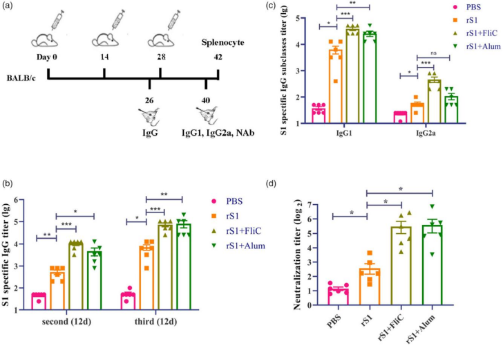 为评估rS1的免疫原性,研究团队以BALB/c小鼠为实验对象,进行了免疫实验。分别肌肉注射三次rS1蛋白,同时设置了添加FliC佐剂、Alum佐剂以及不添加佐剂的组别,每次免疫间隔2周(图3a)。在第二次或第三次接种2周后,发现rS1免疫组小鼠血清中S1特异性IgG抗体滴度显著高于PBS对照组。而且,添加FliC和Alum佐剂的rS1免疫组,其IgG抗体水平显著高于未添加佐剂的rS1免疫组。第三次接种后,rS1诱导产生的S1特异性IgG滴度相较于第二次接种后提高了10倍(图3b)。此外,Alum佐剂的rS1免疫组诱导产生了更高的IgG1抗体反应,而FliC佐剂的rS1疫苗则显著提高了IgG1和IgG2a抗体反应(图3c)。为进一步探究rS1疫苗产生的抗体效果,研究人员进行SARS-CoV-2假病毒进行中和试验。结果显示,rS1 + FliC和rS1 + Alum组小鼠血清中的中和抗体(NAb)滴度显著高于rS1单独免疫组(图3d)。这表明添加佐剂的rS1疫苗能够有效中和SARS-CoV-2假病毒,为其作为疫苗的有效性提供了有力证据。