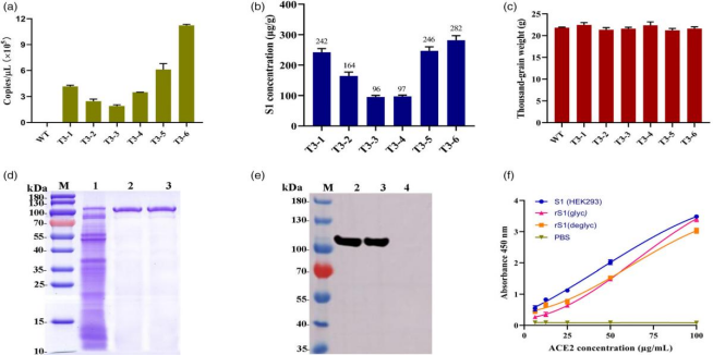 研究人员选取表达水平最高的T3-6转基因水稻种子进行蛋白纯化。结果显示,纯化后的rS1蛋白分子量约为110 kDa,且该蛋白与兔抗RBD蛋白多克隆抗体表现出强烈且特异的反应性,表明其具有良好的免疫反应性(图2d, e)。通过ELISA分析S1蛋白与ACE2蛋白的结合活性,发现S1蛋白与ACE2的结合亲和力随ACE2 浓度的增加而增强。水稻来源的rS1(rS1 glyc)与HEK293细胞产生的S1相比,结合力较弱,但在ACE2浓度升高至100 μg/mL时,其结合亲和力接近HEK293产生的S1。此外,在较低ACE2浓度(<50 μg/mL)下,去糖基化的rS1表现出更强的结合力,而在较高浓度(>50 μg/mL)下,糖基化的rS1结合效果更佳(图2f)。糖基化与去糖基化的rS1蛋白展现出不同结合优势,为理解rS1蛋白生物学特性和疫苗优化设计提供了关键线索。