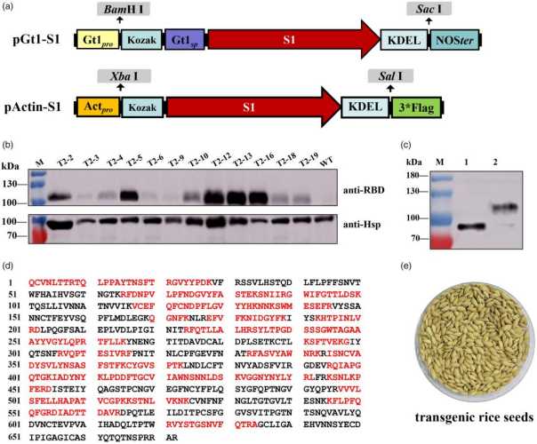 科研人员构建了两个含SARS-CoV-2 S1基因的二元载体,pCAMBIA1300Gt1-S1(水稻谷蛋白启动子Gt1)和 pCAMBIA1300Actin-S1(组成型启动子Actin)(图1a),并通过农杆菌介导转化水稻品种 ZH11,最终获得 56 株独立的T0代阳性转基因水稻植株。随后,科研人员对后代进行筛选。利用PCR分析技术,检测水稻植株中是否含有目标基因;借助潮霉素抗性分离分析,确定T3-1至T3-6植株为纯合子。利用Western blot和质谱分析技术,科研人员在pGt1::S1转基因水稻种子中检测到rS1蛋白。分子量约110 kDa的rS1蛋白条带。质谱分析确认该蛋白为rS1蛋白,检测到S1氨基酸序列的51%,且经PNGase F处理后,rS1蛋白分子量变为约76 kDa,表明发生了N-糖基化修饰(图1b-e)。与之形成对比的是,pActin::S1转基因株系未检测到rS1蛋白表达,凸显了pGt1启动子在驱动rS1蛋白表达方面的优势。