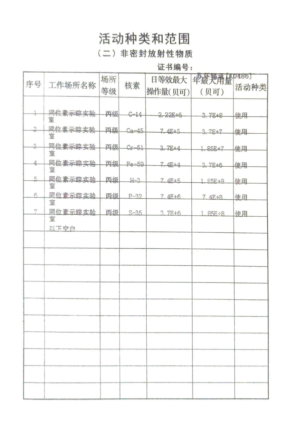 实验室已获批许可使用多种重要示踪核素,包括C-14、H-3、P-32、S-35、Ca-45、Cr-51、Fe-59等,涵盖生命科学、环境检测等多个领域的标记与追踪需求。