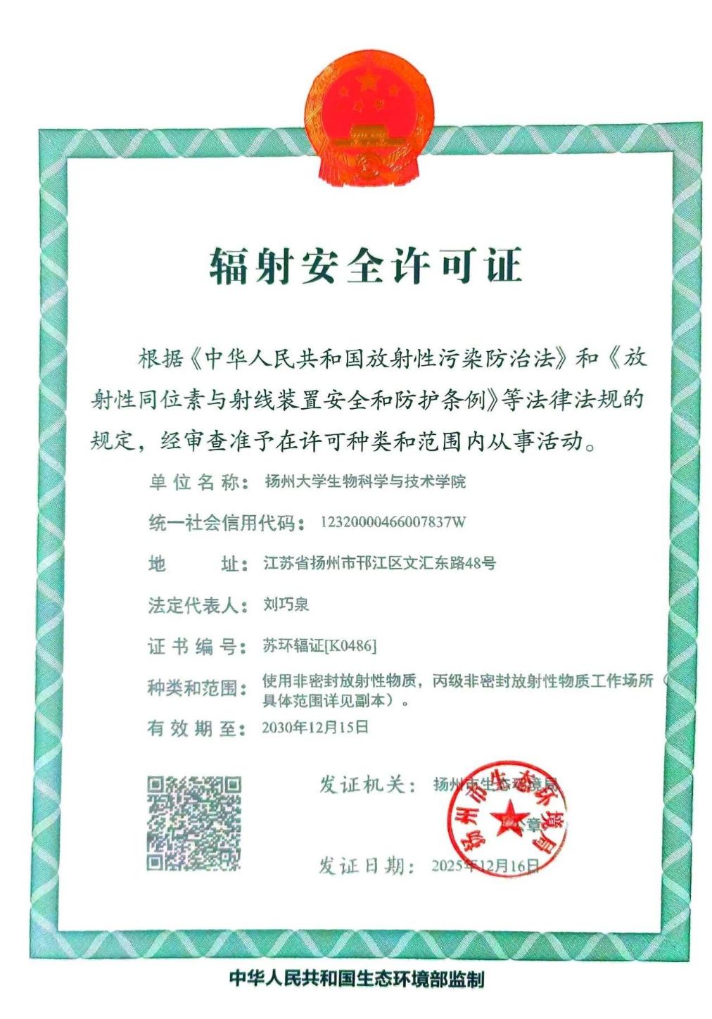 扬州大学生物科学与技术学院同位素实验室已正式成立并取得《辐射安全许可证》(苏环辐证[K0486]),该实验室是扬州市唯一具备放射性同位素示踪实验资质的科研平台。