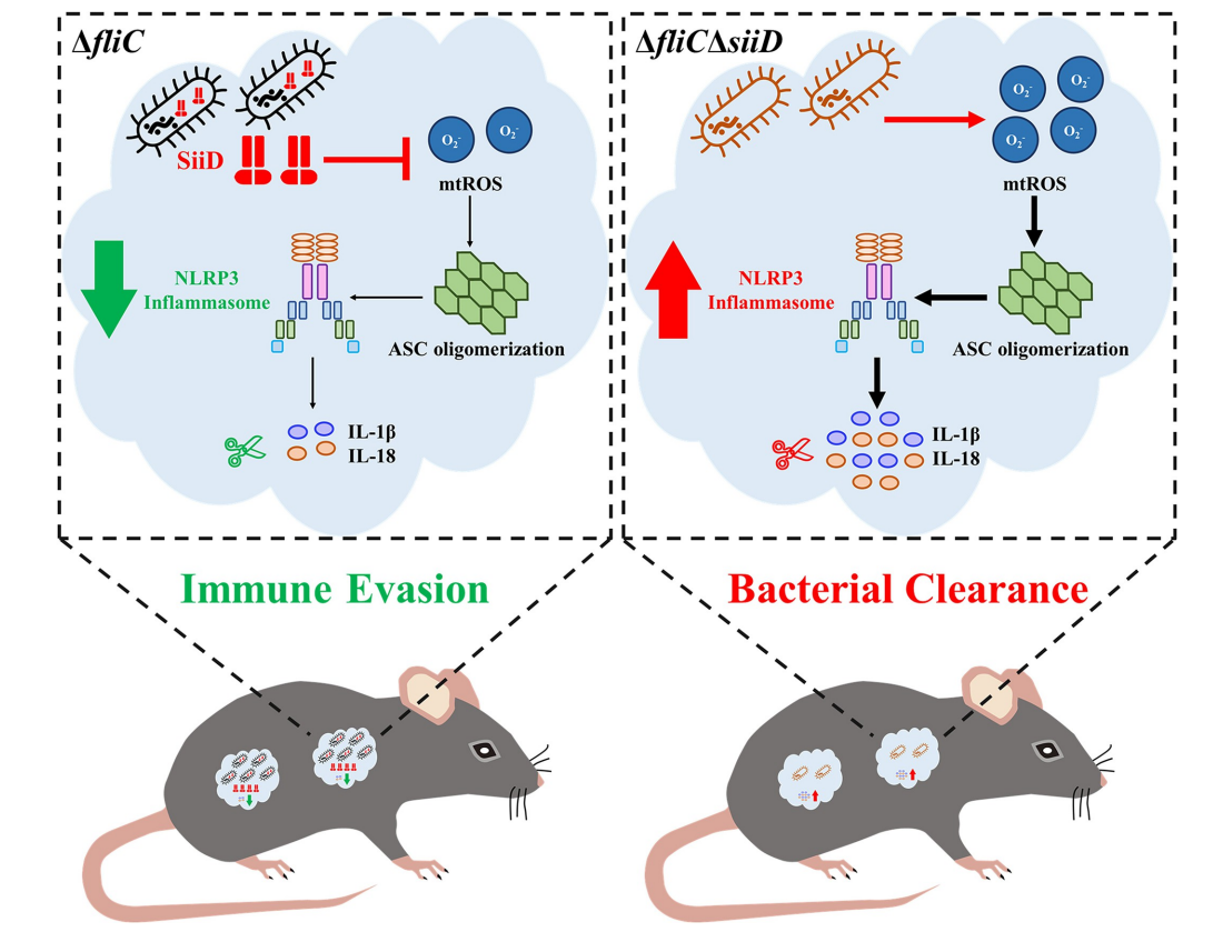 炎症小体活化介导的细胞焦亡在宿主抗感染过程中发挥了重要作用,而抑制炎症小体活化也成为病原菌逃避宿主免疫系统清除的重要途径。本研究首次通过转座子突变体文库在全基因组范围内系统筛选了肠炎沙门菌抑制炎症小体活化的关键分子,发现肠炎沙门菌SiiD蛋白可显著抑制NLRP3炎症小体的活化。研究显示,SiiD蛋白依赖于I型分泌系统(T1SS)转运至宿主细胞内,转运至胞内的SiiD蛋白靶向mtROS-ASC信号通路抑制NLRP3炎症小体的活化。进一步研究发现,肠炎沙门菌能够利用SiiD抑制NLRP3炎症小体的活化逃避宿主免疫系统的清除,实现其在小鼠体内的定植。