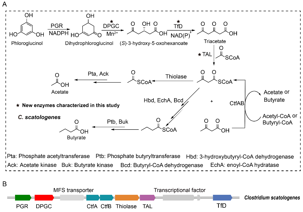 多酚(黄酮和单宁酸等含苯环的多羟基化合物)是植物、蔬菜和水果中最普遍存在的次级代谢产物。植物多酚的生物合成以及随后微生物的降解,使得多酚化合物成为全球碳循环的重要组成部分。间苯三酚作为多酚代谢的重要中间体,其进一步厌氧降解生成小分子脂肪酸的代谢途径及其分子机制不明。