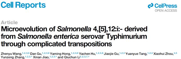 近日,我院焦新安教授团队在《Cell Reports》杂志在线发表了题为“Microevolution ofSalmonella4,[5],12:i:- derived fromSalmonella entericaserovar Typhimurium through complicated transpositions”(DOI: 10.1016/j.celrep.2023.113227)的研究论文,揭示了我国鼠伤寒沙门菌单相变异体的微进化特征及演化机制。
