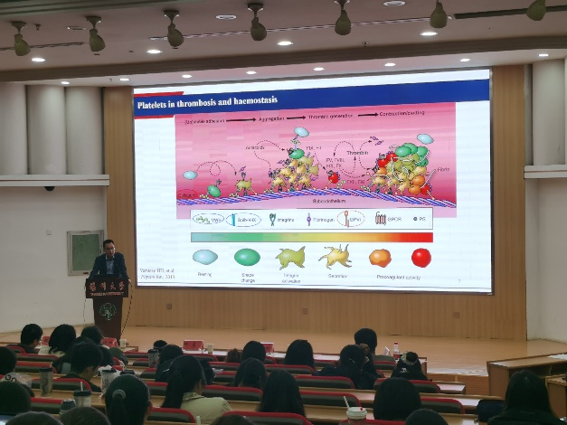徐州医科大学的乔建林教授向同学们介绍了“血小板生成的新机制”,主要让同学们了解血小板的生理特征和功能等,尤其是在血栓和止血中的作用,以此来理解血小板参数升高和降低的意义,并探讨了新型血小板探索和研究过程。