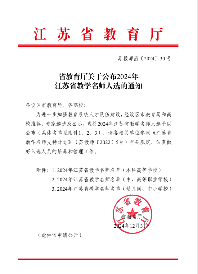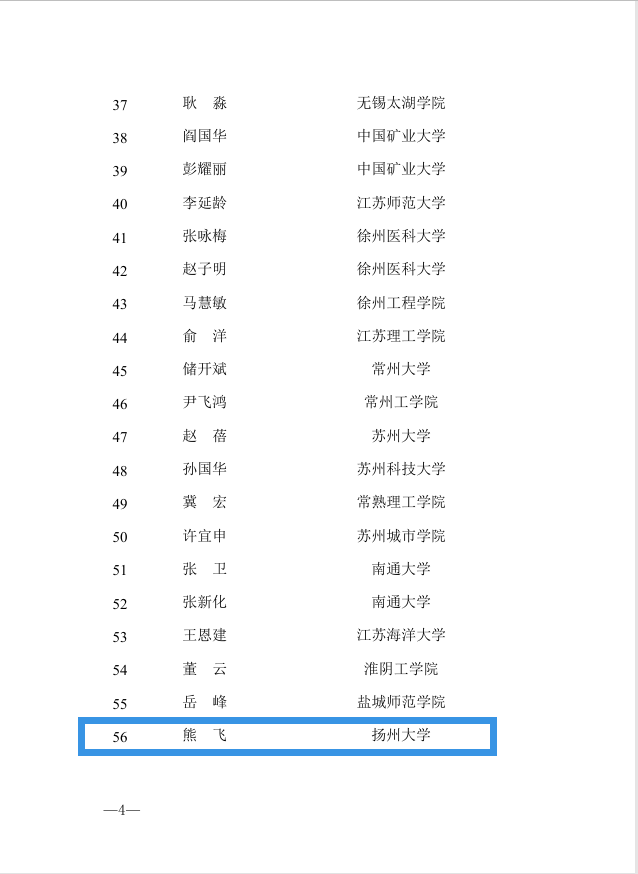 12月31日,江苏省教育厅印发《省教育厅关于公布2024年 江苏省教学名师人选的通知》,我院熊飞教授入选江苏省教学名师。