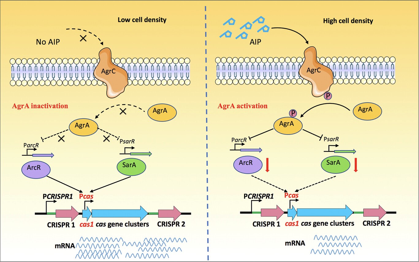 研究团队以携带III-A型CRISPR-Cas系统的MRSA为研究对象,发现QS可抑制III-A型CRISPR-Cas系统的表达及干扰活性,且该抑制作用由QS系统的核心转录因子AgrA介导。通过转录组分析和报告基因检测实验,明确cas基因簇的启动子位于cas1基因内部(Pcas)。以该启动子为诱饵进行DNA pull-down实验,鉴定出两种转录因子SarA和ArcR可直接结合Pcas序列并上调cas基因表达。值得注意的是,AgrA可直接抑制SarA和ArcR的表达。进一步通过分子生物学、质粒转化和噬菌体感染等实验证实:当细菌处于低细胞密度时,AIP信号未积累,AgrA处于非活化状态,SarA和ArcR可结合Pcas促进cas基因表达;而细菌生长至高细胞密度时,AIP信号积累激活AgrA,进而抑制SarA和ArcR表达,间接下调cas基因表达。生物信息学分析显示,革兰氏阳性菌QSagr系统和Pcas序列在葡萄球菌、李斯特菌、链球菌和肠球菌等革兰氏阳性菌中广泛保守,提示QS对CRISPR-Cas系统的负调控可能具有普遍性。该研究首次揭示了QS调控革兰氏阳性菌CRISPR-Cas系统表达的分子机制,为细菌免疫系统的表达调控提供了新视角,并为理解QS在细菌-噬菌体互作中的作用提供了理论基础。