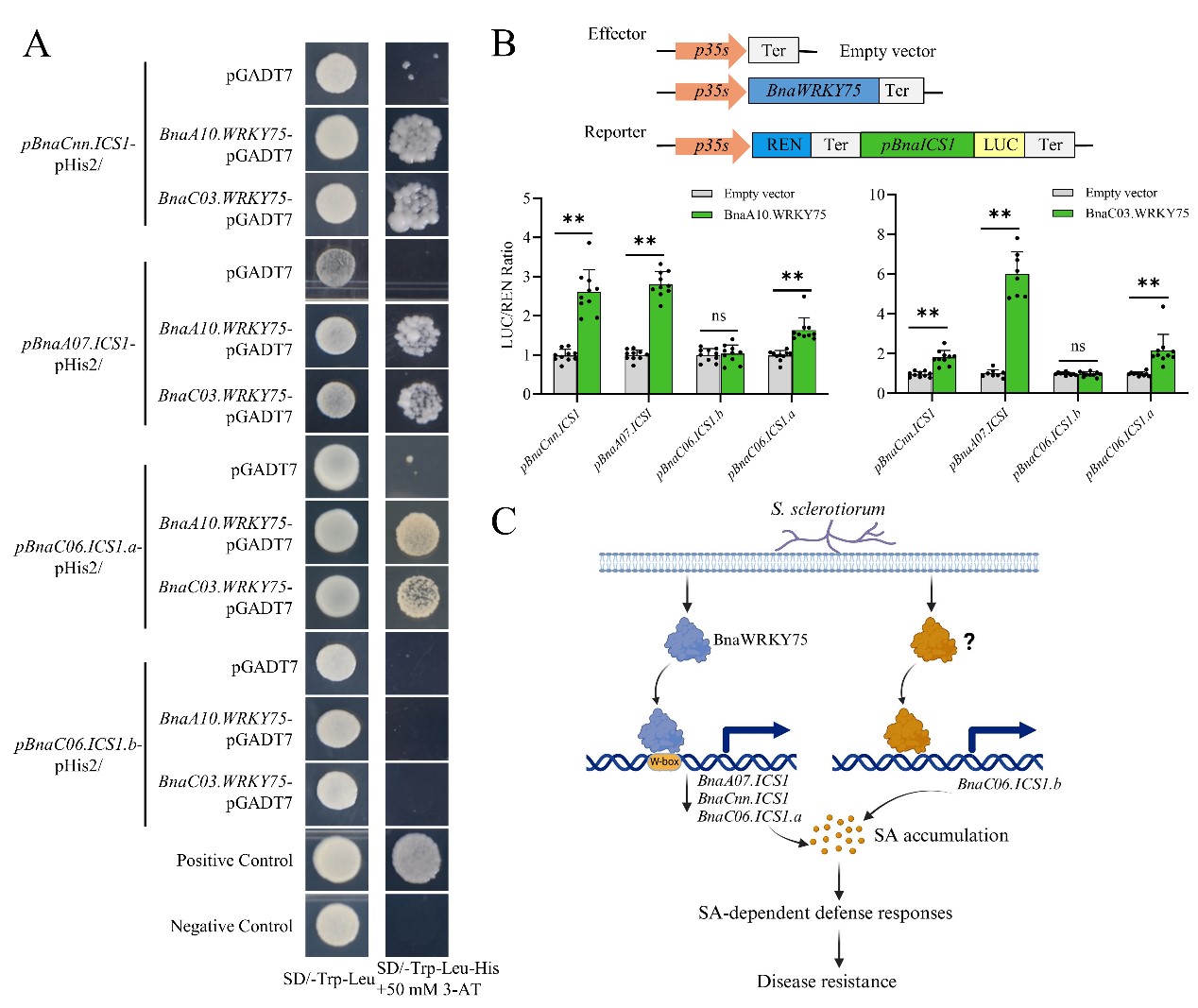 近日,Journal of Experimental Botany在线发表了我院王幼平教授团队题为“The transcription factor BnaWRKY75 enhances resistance to the necrotrophic pathogenSclerotinia sclerotiorumby promoting salicylic acid biosynthesis in oilseed rape”的研究论文。该研究揭示了转录因子BnaWRKY75通过转录激活水杨酸(SA)合成关键基因BnaICS1,促进SA的生物合成,从而显著增强油菜对核盘菌的抗性,为深入理解油菜抗菌核病的分子调控网络奠定了重要基础。