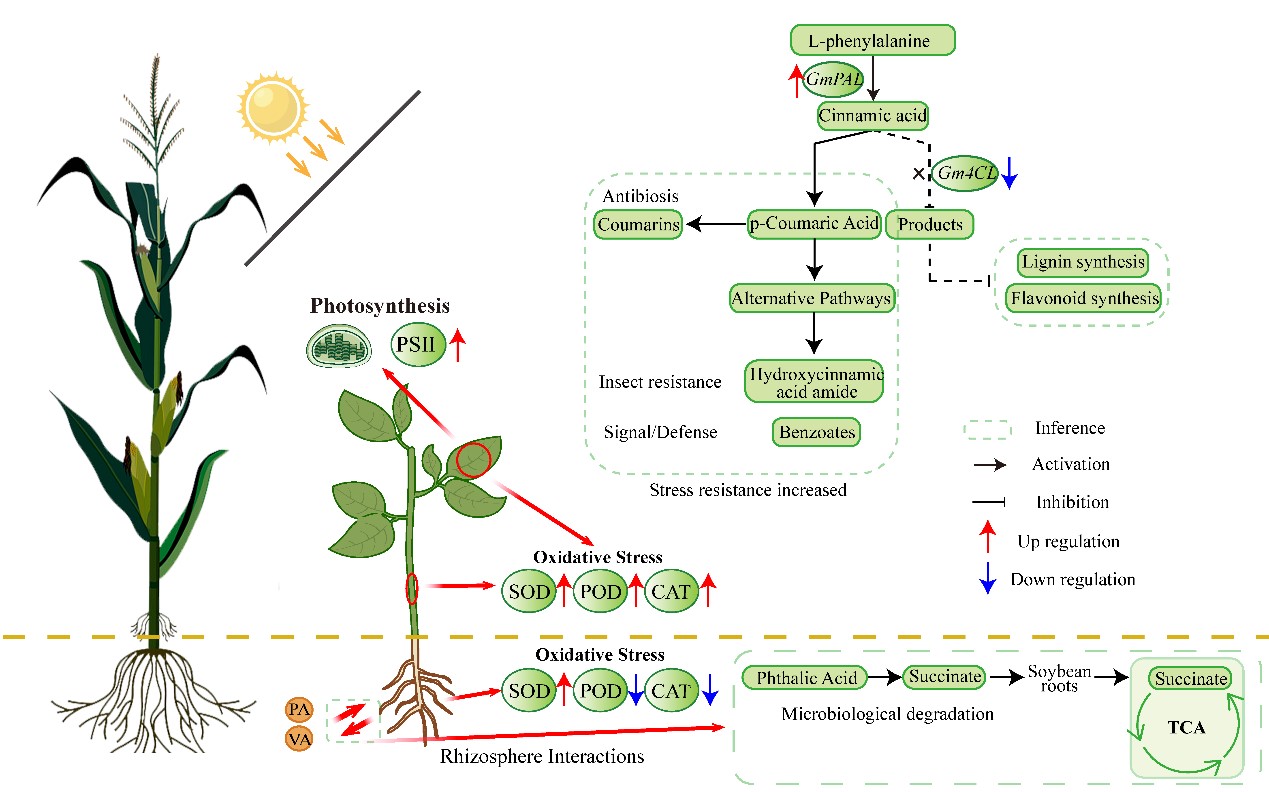 研究进一步整合Mantel检验、加权基因共表达网络分析(WGCNA)和随机森林算法,从1029个代谢物中筛选出三个与产量密切相关的潜在生物标志物:邻苯二甲酸(PA)、香草酸(VA)和大黄素-8-葡萄糖苷。功能研究表明,PA通过调控根系构型与抗氧化系统增强资源获取与逆境适应能力;VA则有助于优化分枝结构与提高茎秆强度,增强抗倒伏能力。三者共同参与苯丙烷代谢、苯甲酸盐降解等关键通路,反映了植株在竞争胁迫下的整体生理状态与资源分配策略。