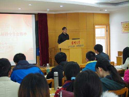 11月4日下午,我院在院二楼报告厅,举办了解读十八届四中全会精神的专题讲座。此次讲座由院党委书记孙云寿老师主讲。全体大四毕业生参与了讲座。