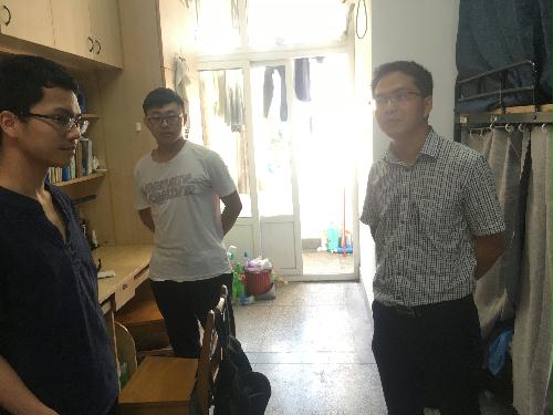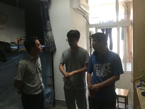 7月13日下午,院领导姚丰华一行对学院学生宿舍进行排查。姚丰华逐一查看了学生宿舍,对宿舍的安全情况、留宿情况、卫生状况进行了实地检查,并与学生座谈交流。