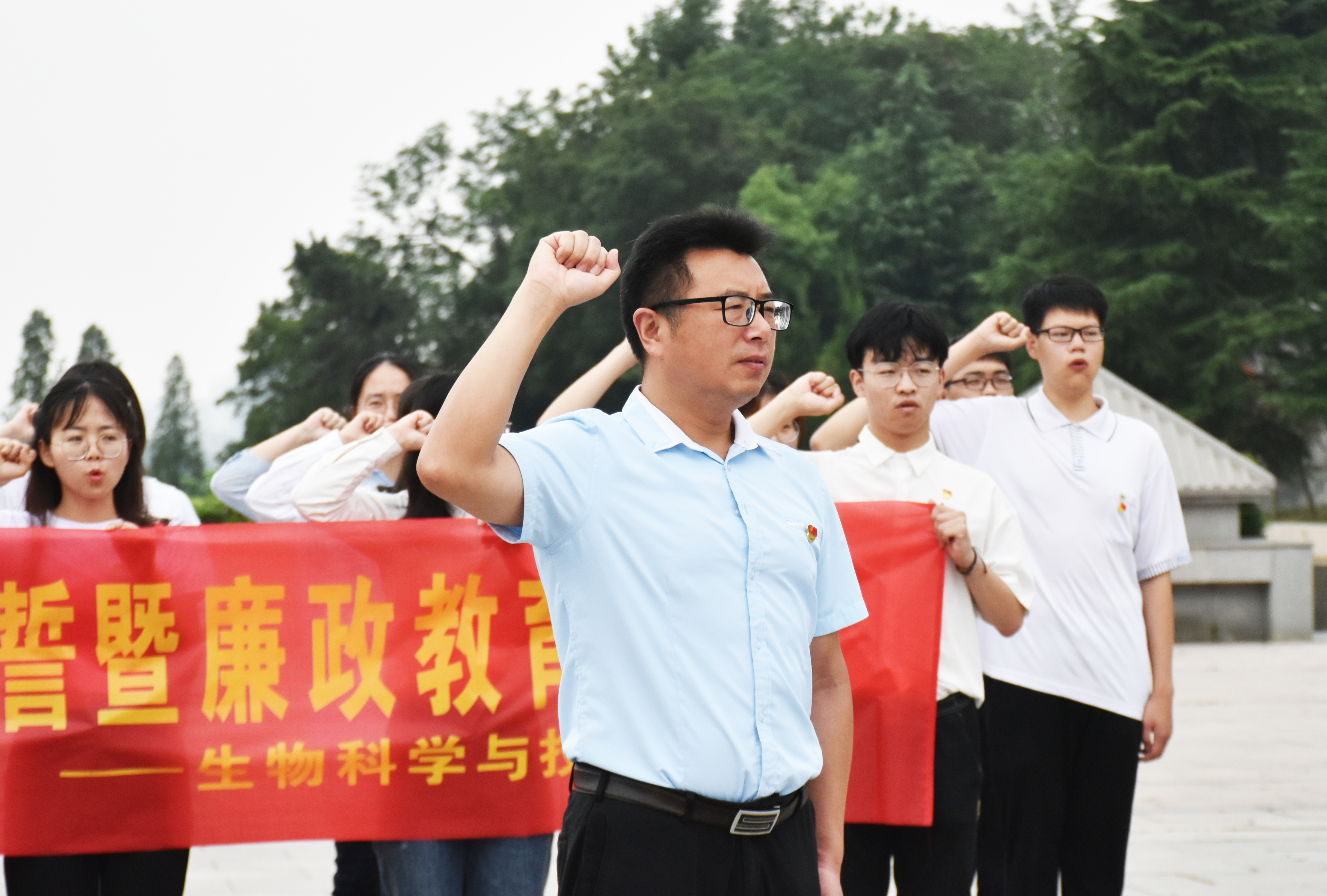 在烈士陵园广场,全体预备党员们统一佩戴党徽,神情肃穆地面向纪念碑站立,并进行默哀,彭晓凤同学代表新党员向革命烈士纪念碑献花。随之进行的是入党宣誓仪式,本次宣誓由王建军书记带领,在高昂的领誓声中,每一名预备党员高举右拳,面对党旗庄重地作出了自己对党的庄严承诺,表达自己对党的无限忠诚和坚定决心。