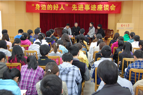 座谈会上,入选“十大扬州好人标兵”和“中国好人”榜的梁隆圣老师与大家交流了自己助人的历程与缘由,获得“见义勇为好青年”荣誉称号和入选“中国好人”榜的刘延章同学和大家分享了入水救人的经过与感想。他们助人、救人的先进事迹引起了参加座谈会全体师生的积极共鸣,大家与两位“身边的好人”进行了深层次的良性互动,纷纷表示要以梁老师、刘同学为人生标杆,努力学习,踏实工作,争做好人!