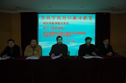 11月30日,我院开展了岗位廉洁专题教育活动。院党委书记孙云寿作学习《中国共产党员领导干部廉洁从政若干行为准则》的辅导报告,院党委副书记王汉林传达学校下发的《关于学习贯彻贺国强同志在部分高校反腐倡廉建设座谈会上重要讲话精神的通知》,并组织大家学习贺国强同志的讲话精神。