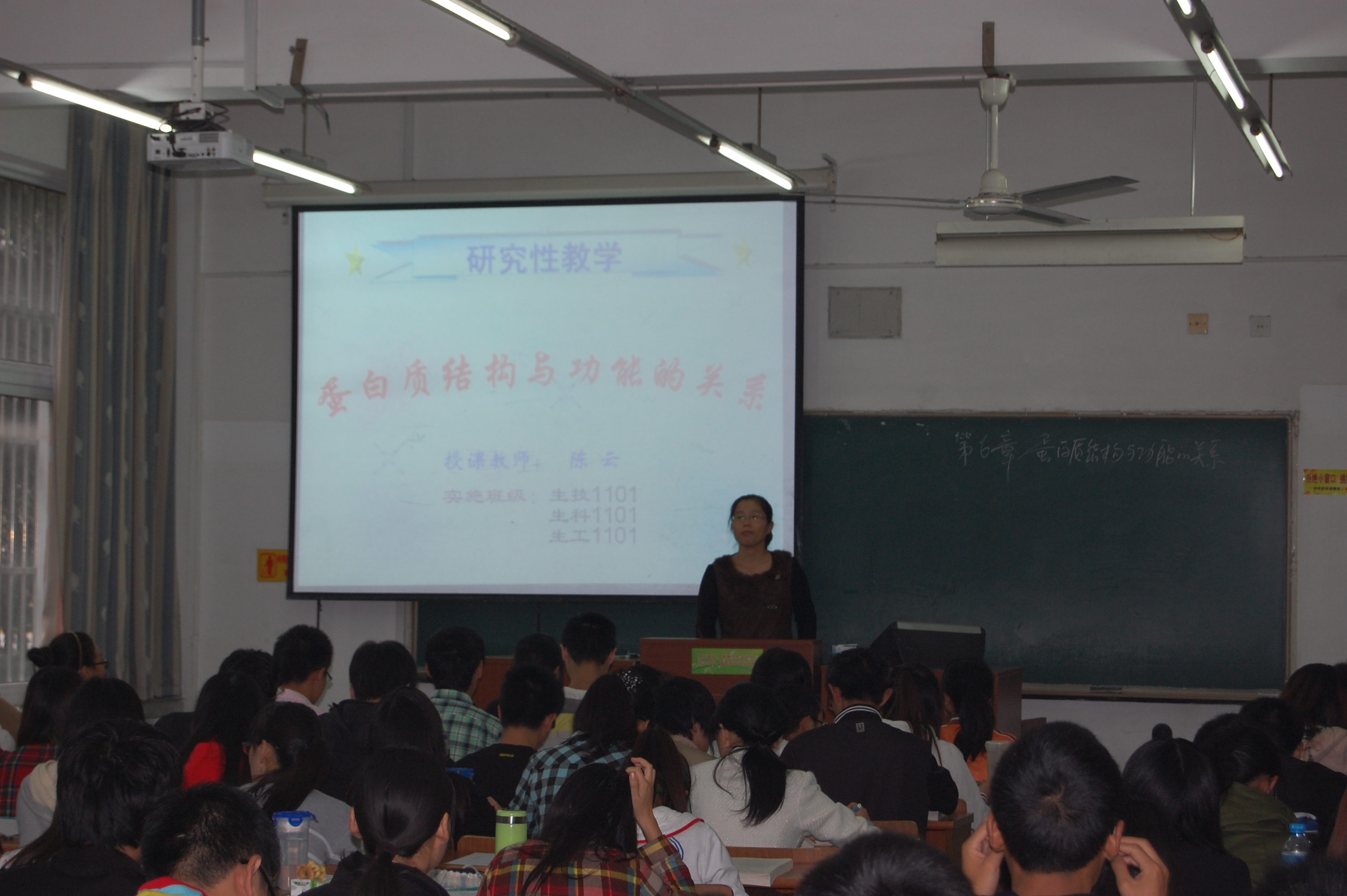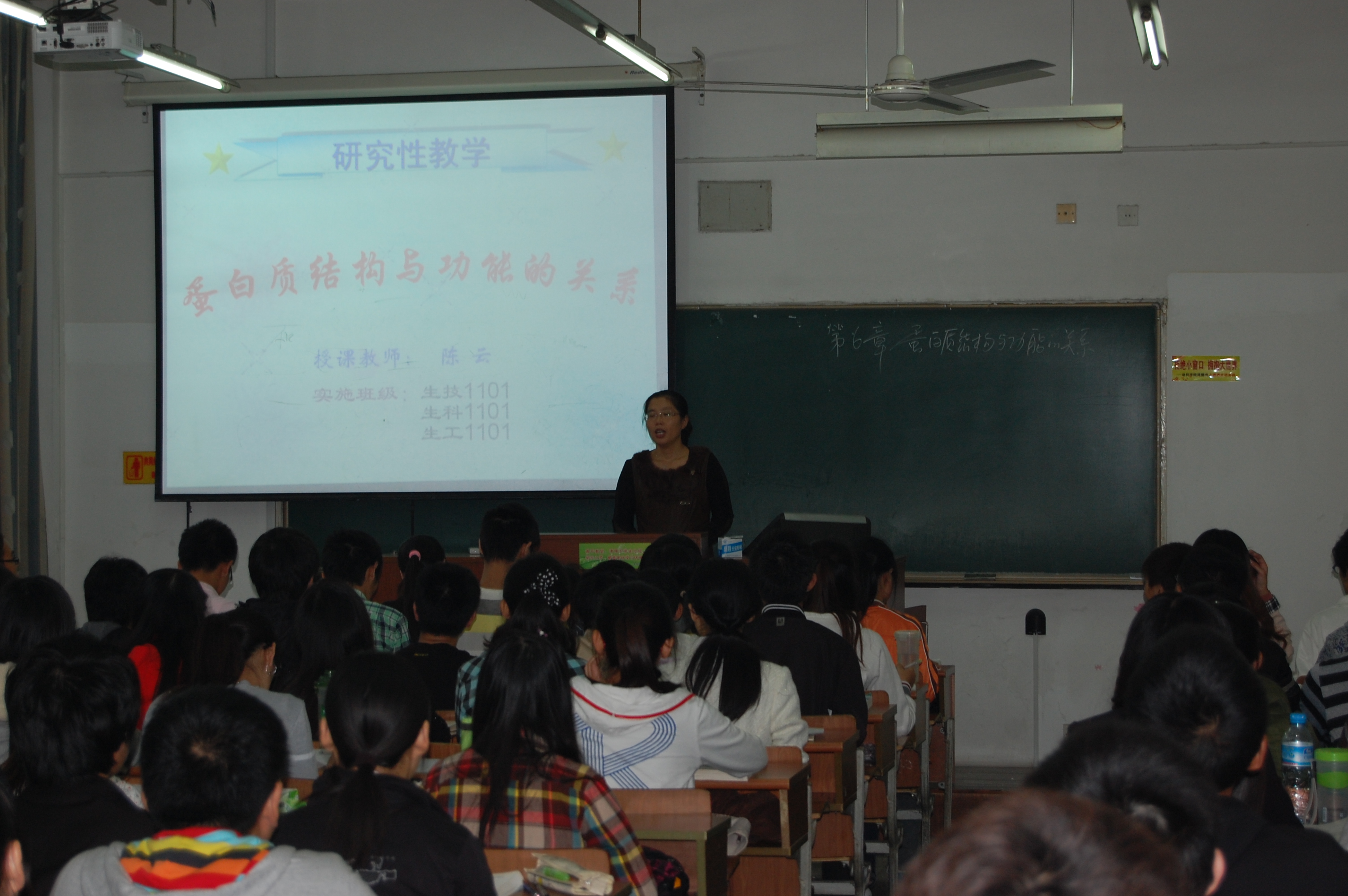 根据教育教学评估中心2012年工作要点和《关于开展研究性教学课程检查的通知》(扬大教[2011]18号)文件精神,学院于2012年10月22日上午举办校级精品课程《生物化学》研究性教学观摩课,主讲教师陈云,参与班级为11级全体本科生。院党委孙云寿书记、王汉林副书记和院部分青年教师以及校督导、专家进行了现场观摩。