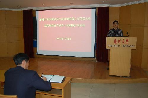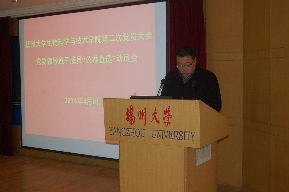 4月8日下午,我院在二楼报告厅召开扬州大学生物科学与技术学院第二次党员大会党委领导班子成员“公推直选”动员会。首先,王汉林副书记宣读了校党委关于同意我院召开第二次党员大会的批复。其次,孙云寿书记向全院教职工介绍了我院第二次党员大会的日程安排、“公推直选”工作的选举办法及候选人基本条件。