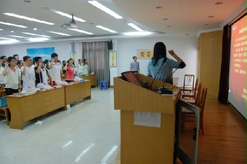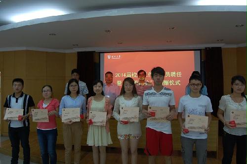 6月18日下午,我院举办2014届校友工作联络员聘任暨“我爱母校”捐赠仪式。学院党委孙云寿书记、王汉林副书记、杨晶老师、杜坤老师为2014届校友颁发了校友徽章,为校友工作联络员颁发了聘书,全体毕业生面对校友徽章庄严宣誓。