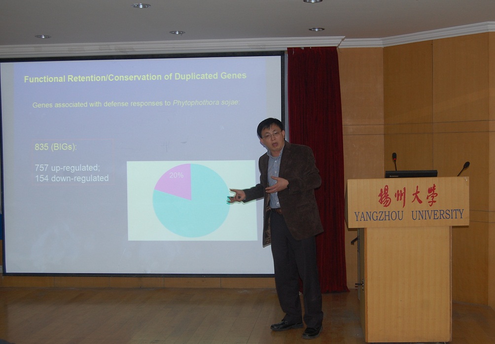 10月13日,美国普渡大学副教授马渐新博士应邀来我院进行学术研讨活动。马渐新博士目前主要研究方向为豆类作物比较基因组学和生物信息学,现为美国国家科学基金会和中国自然科学基金委会审专家,担任国际动植物基因组大会(PAG)转座子分会主席。来我校期间与我院相关研究课题组进行了广泛交流,下午在我院报告厅为师生做了题为“Evolutionary novelty of duplicated genes: A case study of soybean stem architecture”的报告。