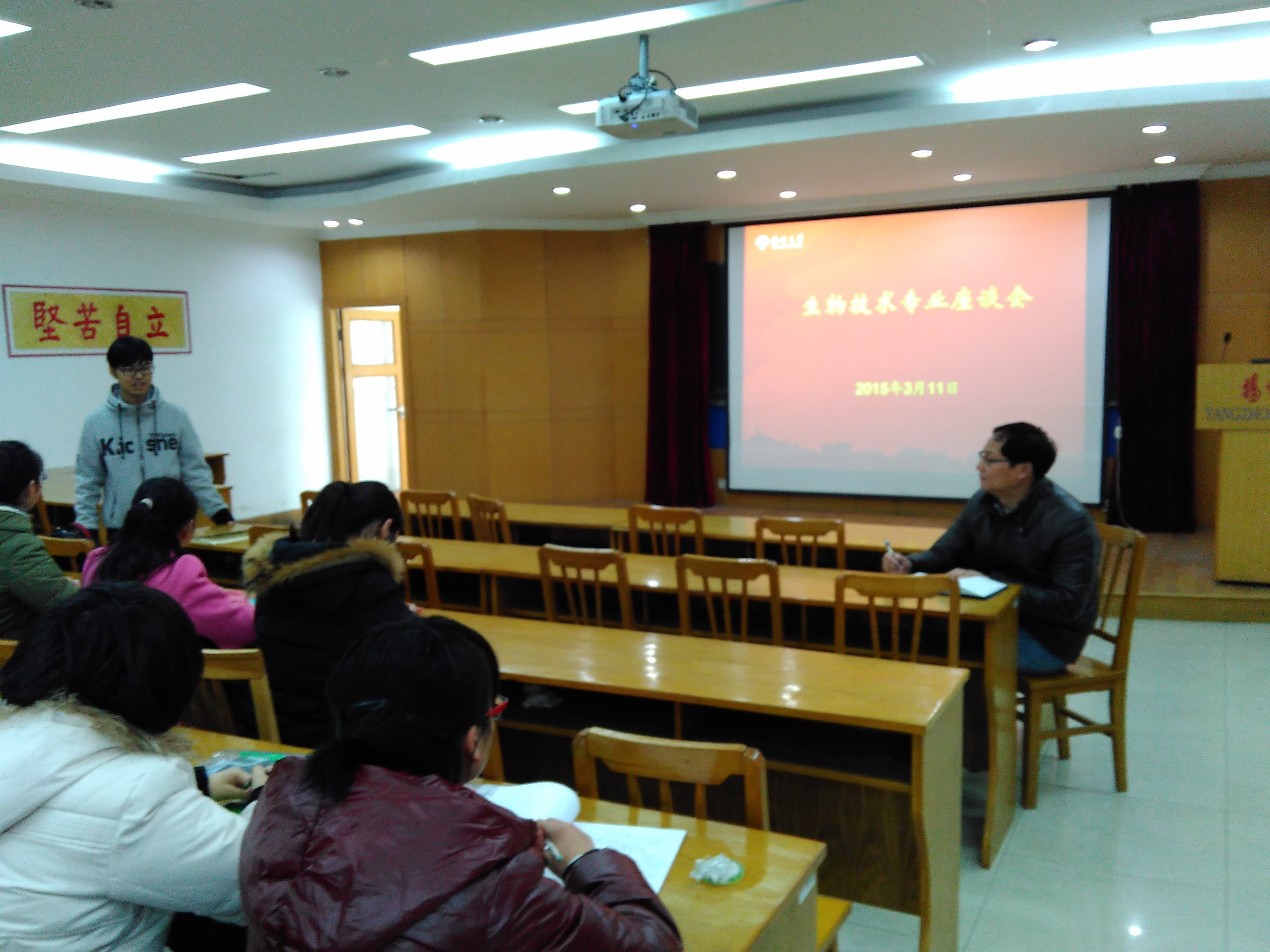 3月11日上午,我院生物技术专业召开了年级座谈会。院生物技术系主任王幼平教授、副主任陈云副教授与我院生技1401班全体同学进行了座谈。在座谈中,王幼平老师与学生就专业的发展、课程内容的学习、大学生活、科研的基本素养等内容进行了交流。座谈会氛围融洽、气氛热烈。生技1401班全体同学经过座谈,统一了专业思想,巩固了专业认知。