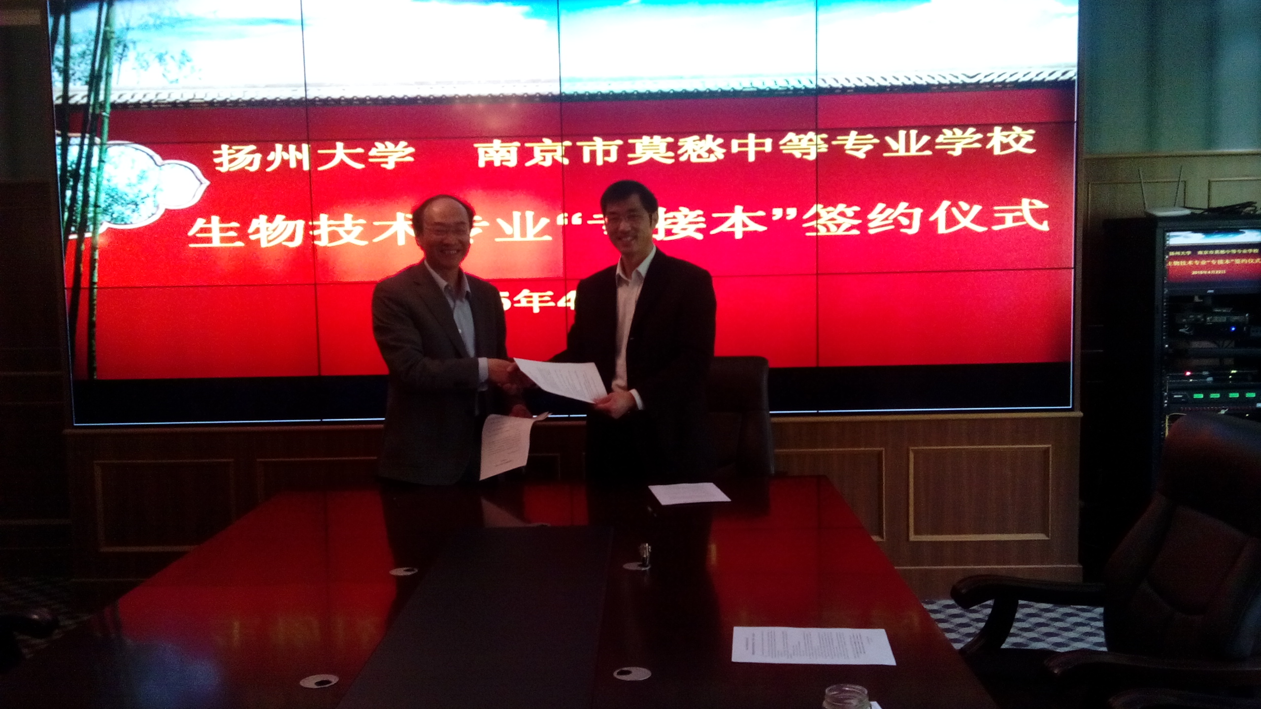 4月22日下午,学院党委书记孙云寿一行三人赴南京市莫愁中等专业学校洽谈生物技术“专接本”专业合作办学事项,双方签订了合作办学协议书。