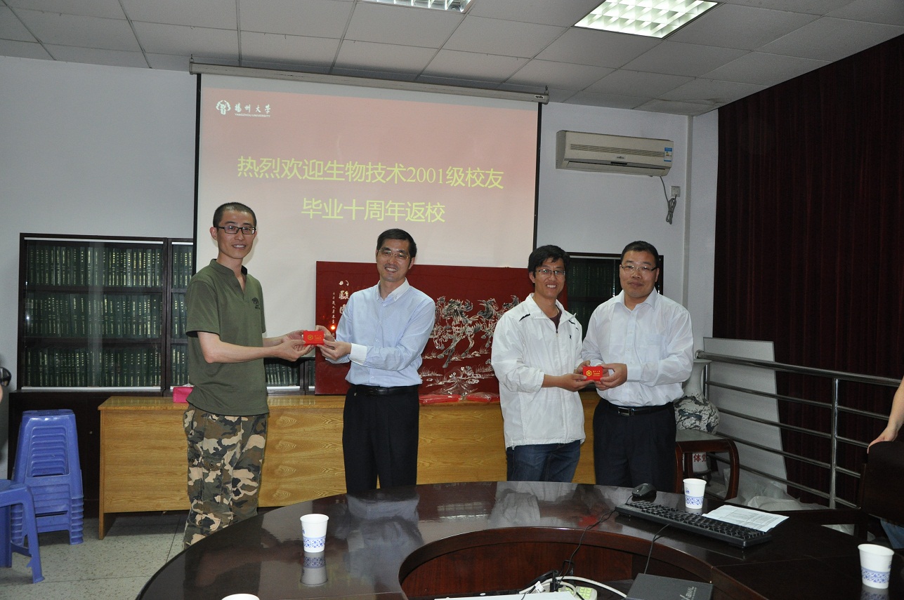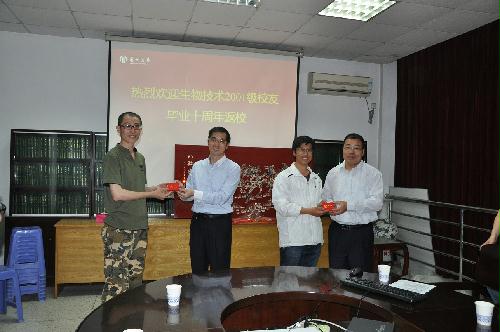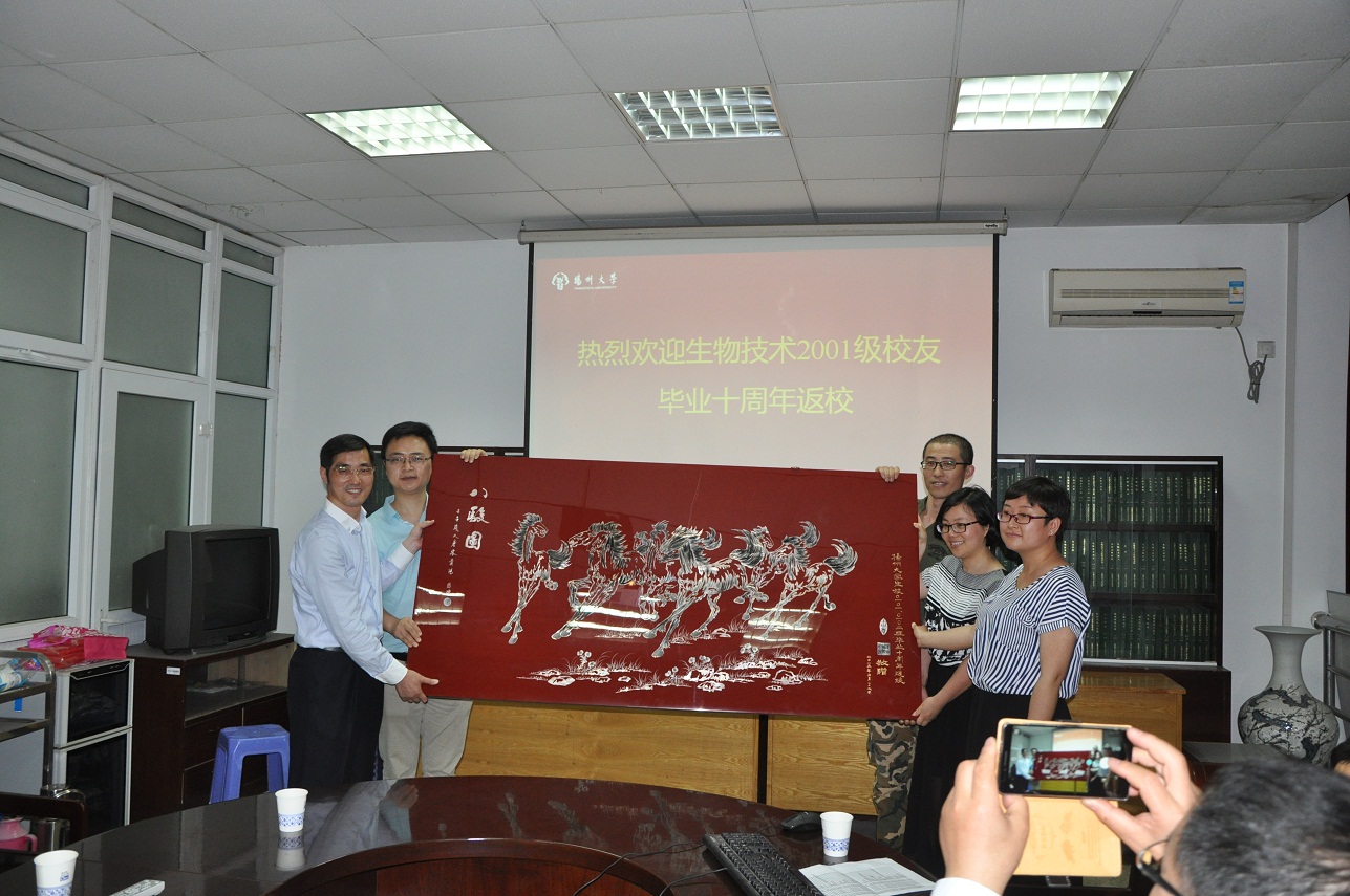 5月23~24日,生技2001级校友返校举行毕业十周年返校聚会联谊活动。在师生座谈会上,院党委书记孙云寿代表学院致欢迎词,介绍了近10年学院的发展概况,并殷切希望校友们在各自的岗位上努力奋斗、建功立业,并且多关心学校和学院的发展。孙书记与王书记一起向校友们颁发了校友徽章,校友们也向母校老师汇报了有关情况,与老师共叙师生之情,并向学院赠送了“八骏图”挂屛,表达了对学院的深厚感情,并祝贺扬州大学建校113周年。