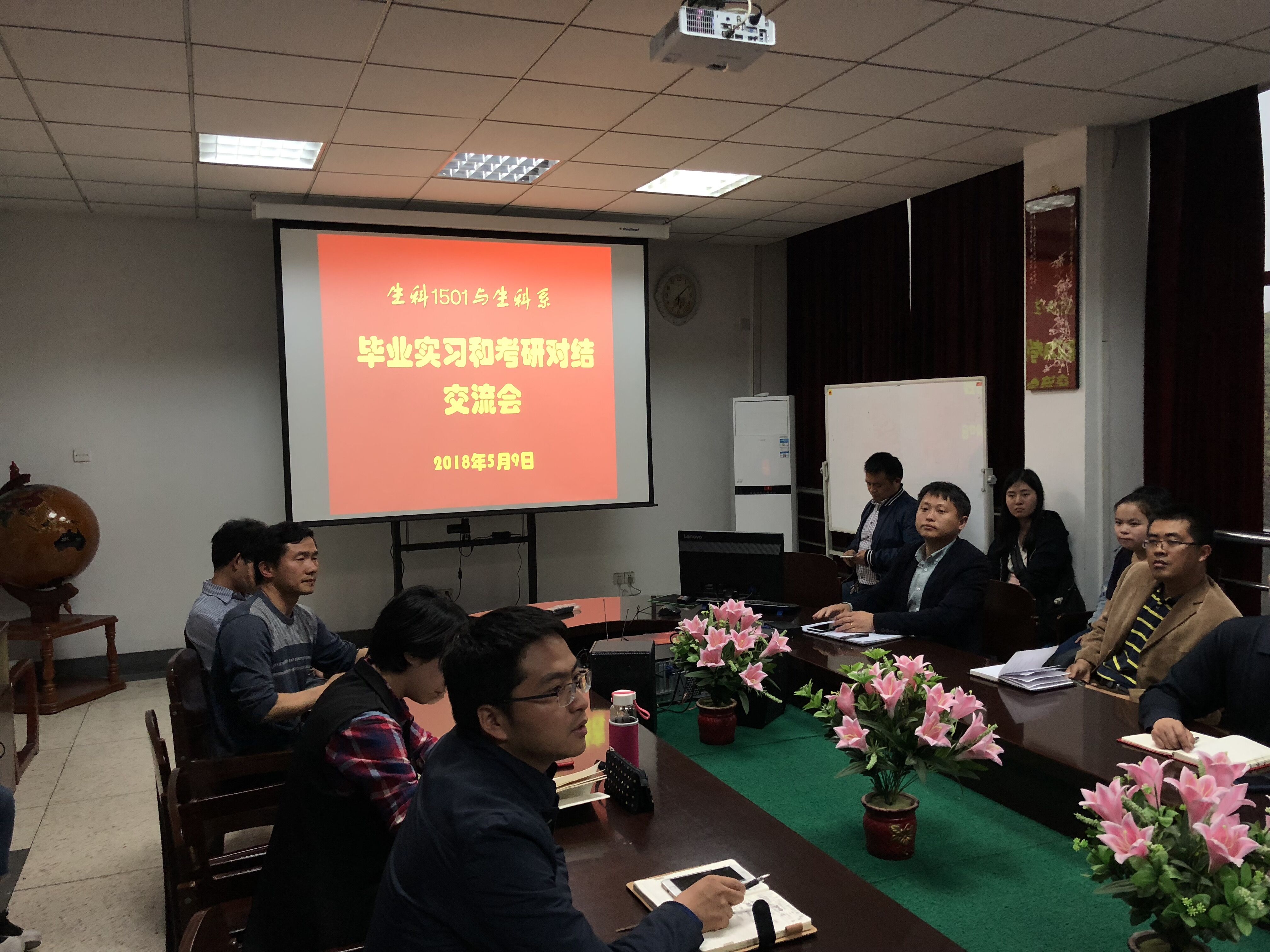 2018年5月9日下午,我院生物科学系在三楼会议室举办了生科专业本科生毕业实习和考研对结交流会,会议由生科系主任熊飞教授主持,院党委副书记姚丰华出席会议。会上余徐润、殷宝法、丁海东、吕冰、胡学运5位老师分别代表课题组、实验室将相关科研工作、人才培养、对外交流等基本情况向同学们进行了详细的介绍。姚丰华总结会议并对在座同学提出了三点期望:一是要明确定位、早定目标,有针对性的选择考研学校;二是要脚踏实地、稳扎稳打,争取获得更好的成绩;三是要虚心求教、树立规矩,切实提升实习实践成效。会后同学们与任课教师进行了深入交流,明确了自身的发展方向。
