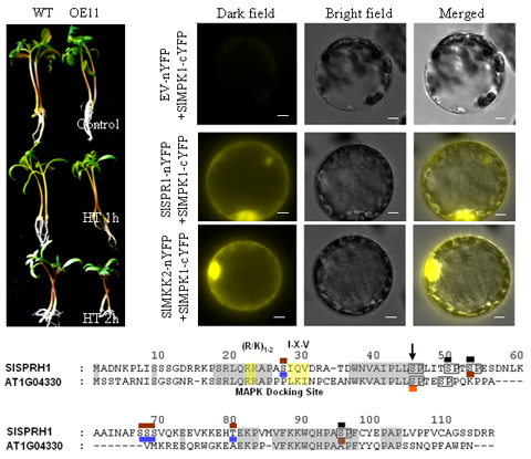 促分裂源活化蛋白激酶(mitogen-activated protein kinase, MAPK)在响应各种环境胁迫的生理状态与基因表达方面,起着重要的作用。然而,人们对MAPK是如何调控高温信号应答过程的知之甚少。本研究通过蛋白纯化及MS/MS质谱分析,获得高温响应的SlMPK1;通过SlMPK1干扰(RNAi)和过表达(OE)植株表型分析,SlMPK1-RNAi植株能够应答高温信号,存活率高,具有明显的耐高温表型,而OE植株耐高温能力下降;通过蛋白质组学及生理生化方法进一步发现SlMPK1应答高温的机制与SlMPK1介导的抗氧化系统防护及氧化还原代谢有关;最后,通过酵母双杂交(Y2H)鉴定了一个与SlMPK1互作蛋白SlSPRH1。研究发现,SlSPRH1是SlMPK1的靶蛋白,能够被SlMPK1磷酸化。过表达SlSPRH1能够降低植物的耐高温性且与SlSPRH1的磷酸化相关。该研究表明SlMPK1-SlSPRH1作用模块在高温应答过程中负调控高温信号且协同抗氧化胁迫系统,为MAPK参与植物高温应答提供了理论依据。