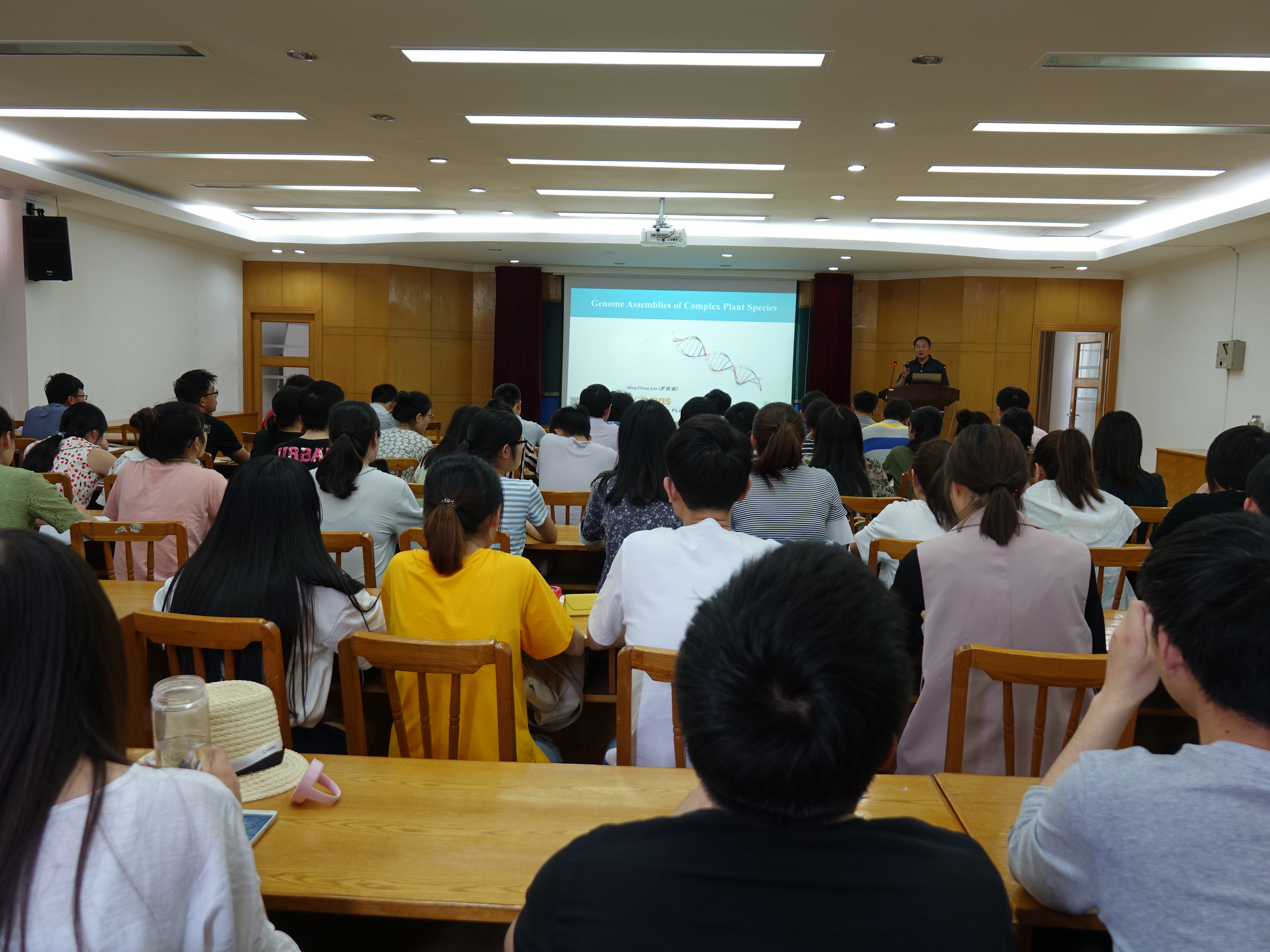 罗教授主要以小麦族植物及核桃为例,介绍了其团队在组配大、复杂、杂合或多倍等复杂植物基因组中的基础及创新工作,详细讲述了在该过程中发生的具有启发式的研究故事,引起了教师及学生的广泛兴趣,并科学地回答了教师及学生的提问。最后,罗教授还热情地介绍了加州大学戴维斯分校的基本情况,欢迎感兴趣的同学前去交流和学习。