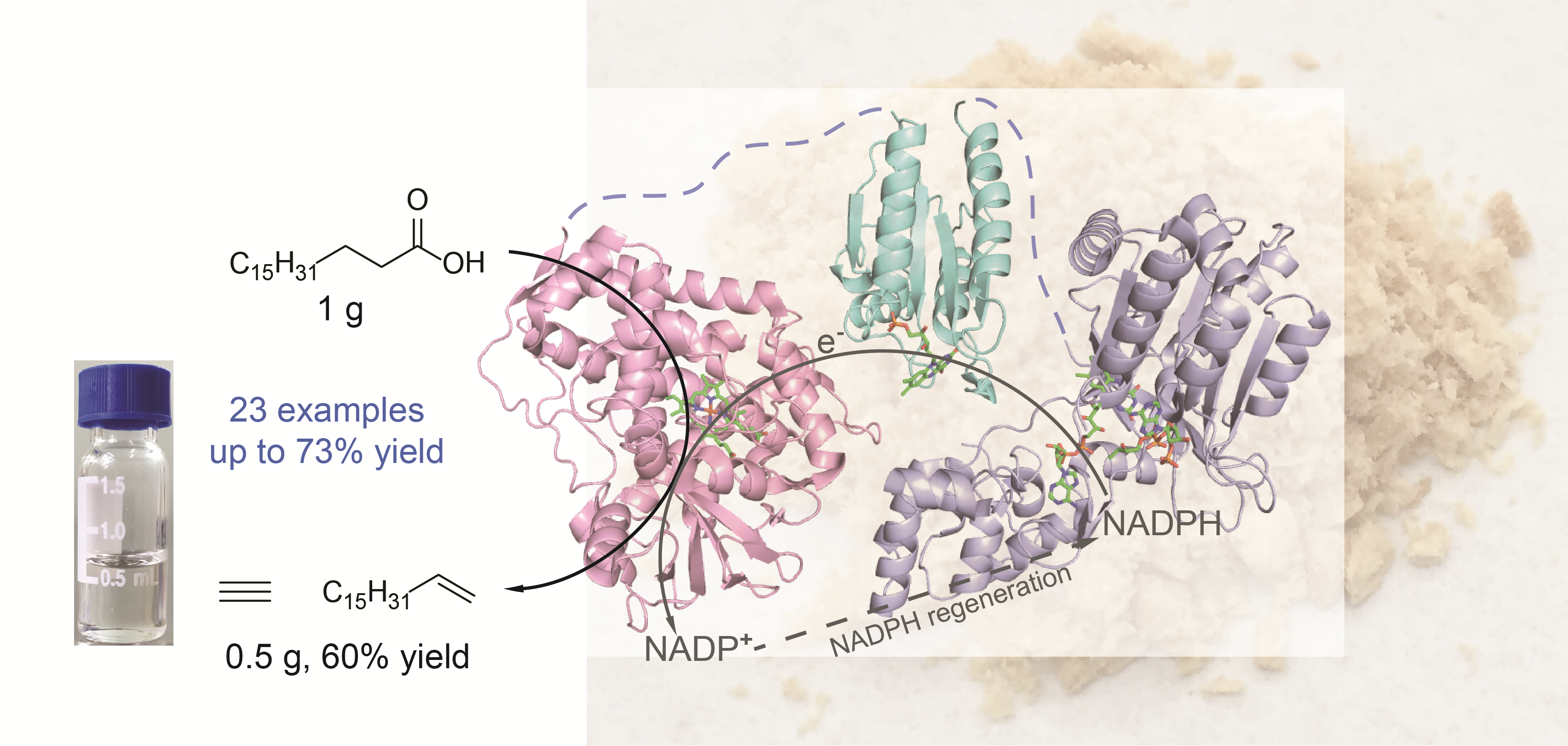 该课题组将脂肪酸氧化脱羧生成ɑ-烯烃的脂肪酸脱羧酶OleTJE与巨大芽孢杆菌脂肪酸羟基化酶P450BM3的还原结构域相融合,构建了一个具有兼容的电子传递系统的新型融合蛋白OleT-BM3R。这样使脂肪酸氧化脱羧生成ɑ-烯烃的反应能够摆脱对H2O2的依赖,通过自身的电子传递系统,利用O2为氧化剂,NADPH为电子供体,在环保的水溶液中,在温和的环境温度下进行。同时将基于亚磷酸脱氢酶的NADPH再生系统耦合到反应中,可以以廉价的亚磷酸钠为最终的电子来源,克服了NADPH价格昂贵的限制。新的融合蛋白较其他体系具有反应体系简单、反应活性高、反应底物范围宽(饱和脂肪酸C4-C20,以及末端带不同官能团的羧酸如:双键、苯环、环烷基、酮、醛、卤素、羟基、双羧酸等)等优点。同时该酶具有良好的稳定性并且在极少的催化剂的用量下得到较高的烯烃产率。此外,含有该酶的发酵液在不加入NADPH的反应体系中就能直接催化脂肪酸脱羧。上述特质显示了该融合蛋白在生物能源和工业生产方面巨大的应用前景。目前该合作组仍在研究寻求对该融合蛋白的进一步改造。