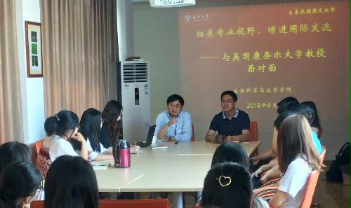 6月11日,我院在二楼工作坊举办“我与康奈尔大学教授面对面”活动。康奈尔大学教授甘苏生与我院大学生代表进行了座谈。院领导姚丰华主持活动。