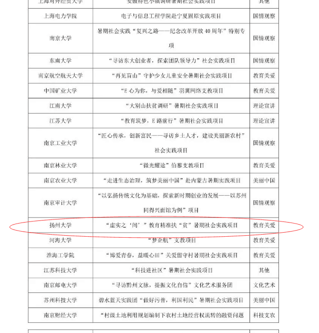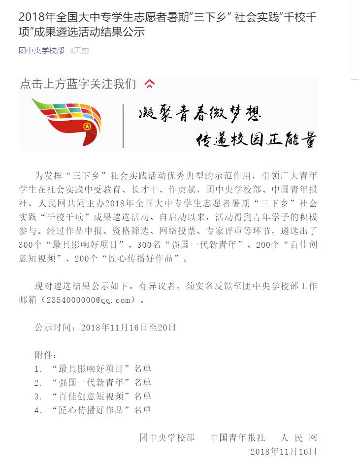 近日,由共青团中央、中国青年报社、人民网共同主办的2018年全国大中专学生志愿者暑期“三下乡”社会实践“千校前项”成果遴选揭晓。我院团委组织并指导的大学生暑期社会实践团队“虚实之‘间’”教育精准扶“贫”暑期社会实践项目,获评“最具影响好项目”。我院作为扬州大学唯一团队获得此项殊荣。