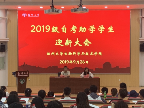 9月26日下午2:30,我院在荷花池校区逸夫报告厅召开2019级自考助学学生迎新大会。学院党委书记王建军、办公室主任杨晶及成教负责老师宋珍珍参加了此次会议。会上,宋珍珍老师介绍了接本两年的学习任务、班干部的选派工作以及达到毕业学位的相关要求。杨晶主任提出的大学三问,直指接本学生在校应该考虑的核心问题,同时杨主任鼓励接本学生要积极参加学院本科生各个社团职位的竞选,增加锻炼自己的机会。王建军书记首先用“春风十里,不如在扬州大学遇见你”表达了对接本学生入校的欢迎,接着王书记就在大学如何学会做人方面给学生上了一堂生动的思想教育课,最后王书记希望学生能够努力学习,在扬大收获一份美好的回忆,为自己的未来打下坚实的基础!