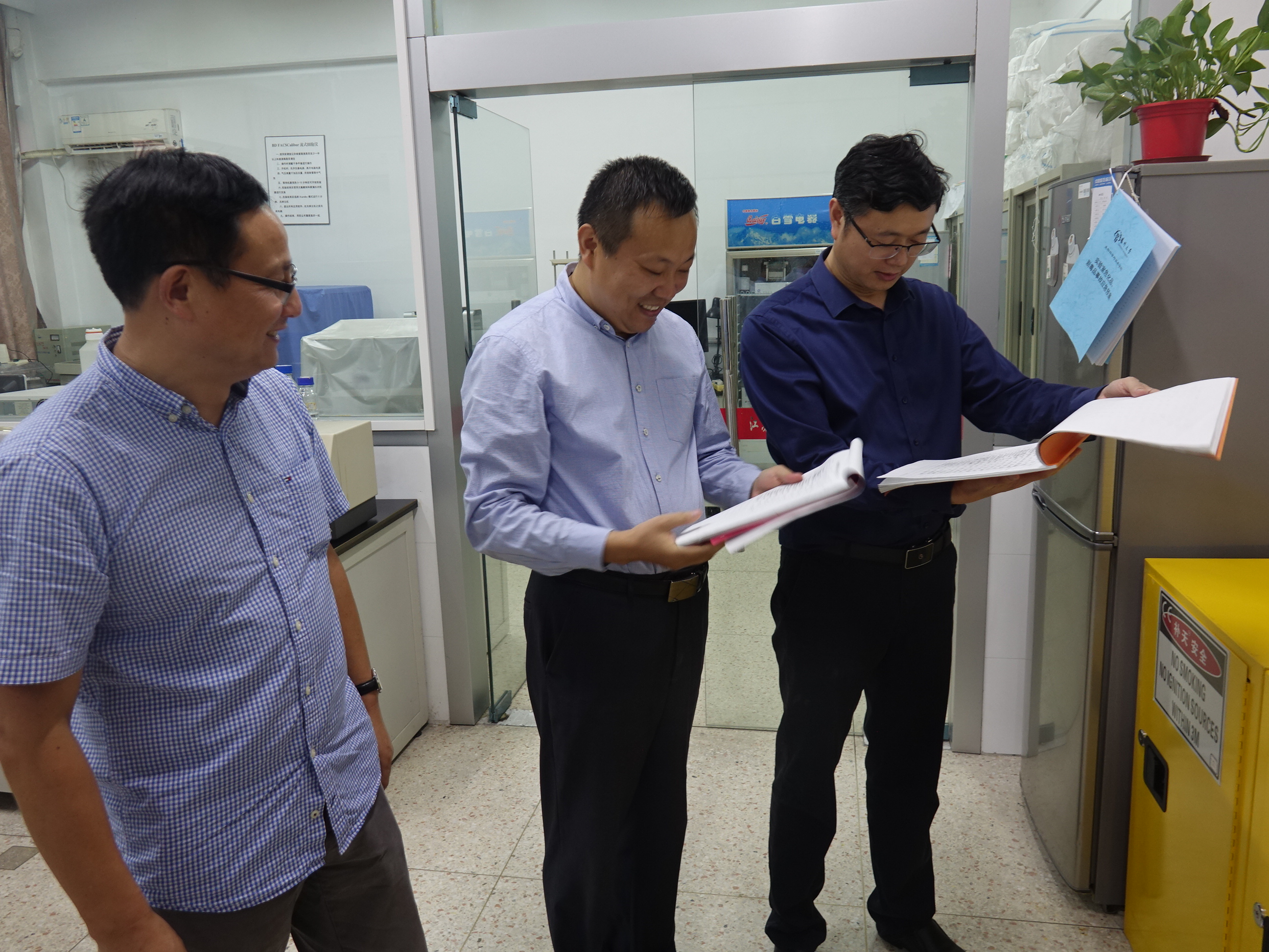 王幼平副院长、熊飞副院长以及院办相关工作人员一起走访检查了各个实验室。院领导一行详细查看了实验室的安全设施、试剂药品存放状况、实验器材配置及实验室卫生情况,检查了高压容器运行、危化品领用登记记录,针对发现的安全隐患与实验室安全员进行了沟通,并提出了明确的整改建议,确保假期期间实验室工作的顺利进行。