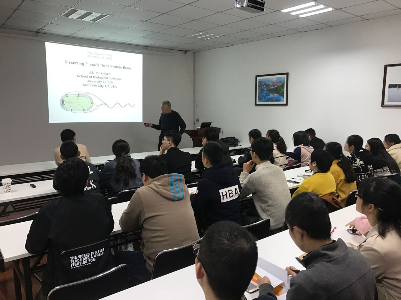 Parkinson教授介绍了他的课题组长期以来从事细菌趋化性通路的研究成果;讲座后,师生踊跃提问,积极互动交流。会后继续与我院相关从事细菌趋化性的师生进行了相关课题的探讨和未来合作的讨论。