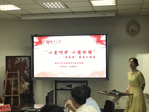 在本次的汇报会中,生科1601班长李灵芝同学首先进行了汇报演讲,她深情地阐述了“麻袋班”的发展历史和公益成就,向大家介绍了班级的管理与建设状况,“麻袋班”师生深深认识到自己所担负的使命与责任,让与会者感受到了“麻袋精神”的魅力。