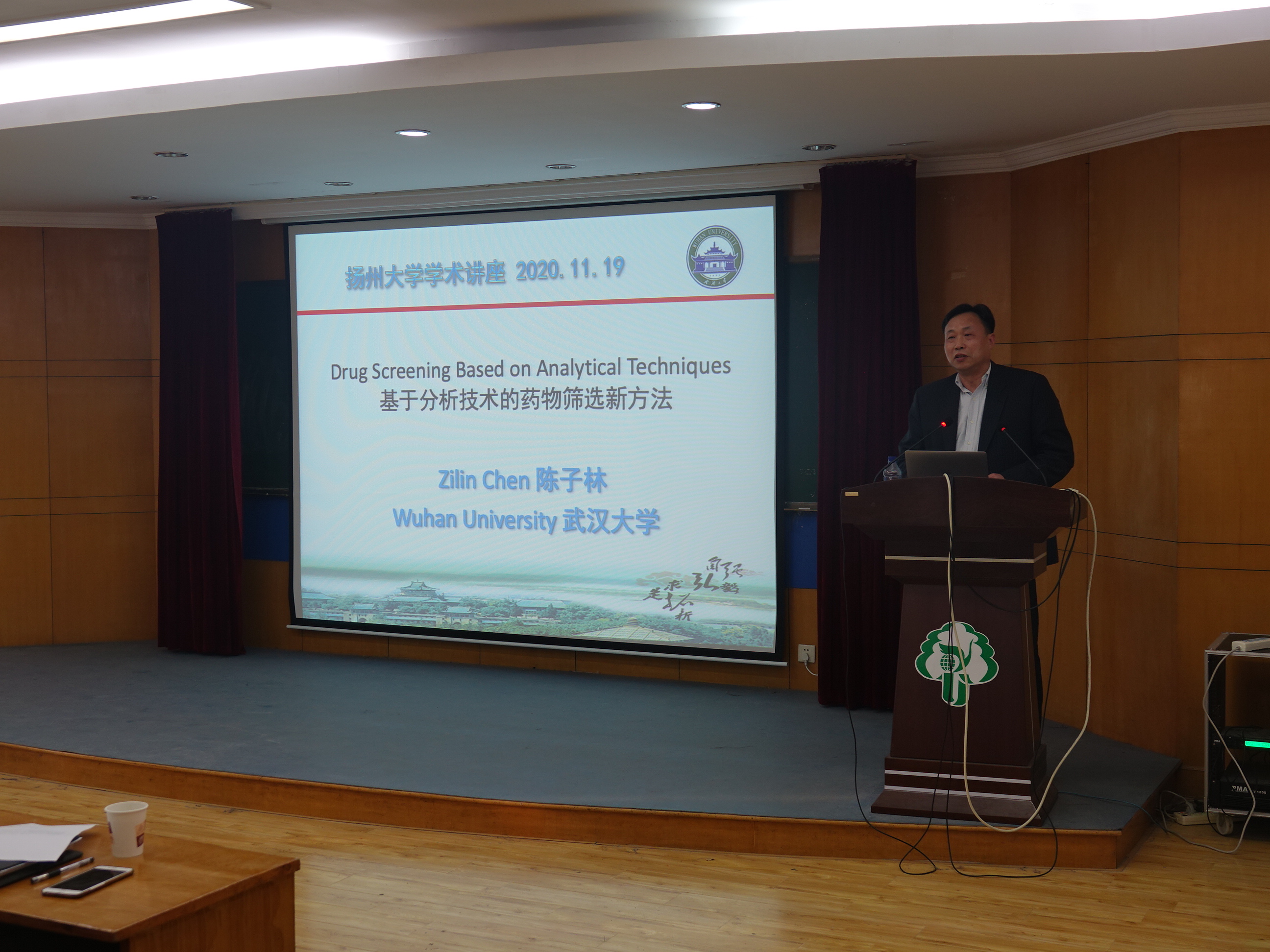 陈子林教授目前担任武汉大学药学院副院长、药物分析与筛选研究所所长、药学实验中心主任。报告会上,陈教授以《基于分析技术的药物筛选新方法》为题,向我院师生介绍了现代小分子药物筛选的新方法及应用前景。以毛细血管电泳技术、基于固定化酶微反应器为例,深入讲解了其课题组针对乳腺癌细胞、禽流感病毒等靶标筛选小分子药物的案例。