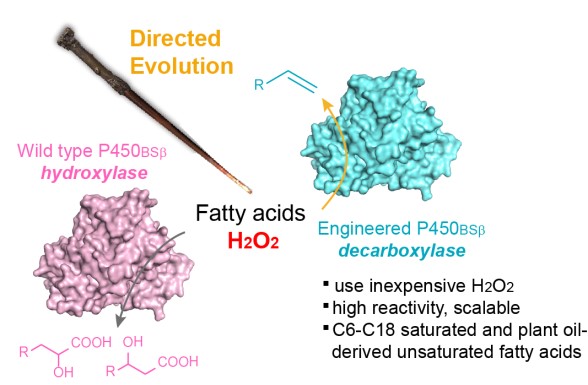 该课题组受P450酶催化途径的启发,利用定向进化技术将一脂肪酸羟基化酶转化为脂肪酸脱羧酶,实现了利用便宜的H2O2驱动脂肪酸氧化脱羧生成1-烯烃。改造后的脂肪酸脱羧酶不仅继承了母本羟基化酶的H2O2耐受性和催化的高效性,更扩大了底物范围——能够将C6-C18的饱和脂肪酸以及油酸和亚油酸天然不饱和脂肪酸催化成为相应的烯烃产物。该研究为研发新型脂肪酸脱羧酶提供了新的思路,也为高效、经济、可持续合成1-烯烃开辟了新的途径。