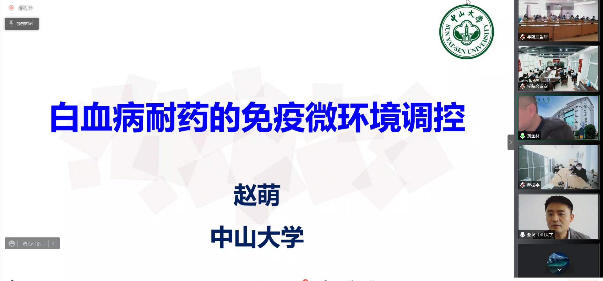 会议伊始,黄金林院长向大家介绍了本次会议的主题,并对与会专家表示了热烈欢迎。随后,会议交由郝振宇教授主持,六位专家分别对自己的研究领域作了精彩的报告。张雁教授向大家讲解了使用比较基因组学和化学引导的生物信息学解析微生物重要的新酶和新代谢途径的研究。余佳教授介绍了RNA、RNA互作蛋白质及相关遗传信息传递过程在干细胞或疾病中的功能和调控机理。赵萌教授对氨基酸代谢在白血病干细胞及肿瘤免疫微环境中的作用和机制作了详细讲解。朱平研究员介绍了其利用单细胞技术方法绘制细胞图谱,并以此为基础解析再生障碍性贫血分子机制的研究。钱鹏旭教授介绍了RNA修饰及其相关的酶在造血干细胞稳态及白血病中起着极其重要的作用。朱力教授则对血小板与动脉血管相互作用,及其在预防动脉粥样硬化和心脑血管疾病的重要作用作了详细阐述。本次论坛促进了生物学与医学之间的交叉融合,增进了不同学科领域间的交流沟通,也极大拓宽了学生的视野和知识面。