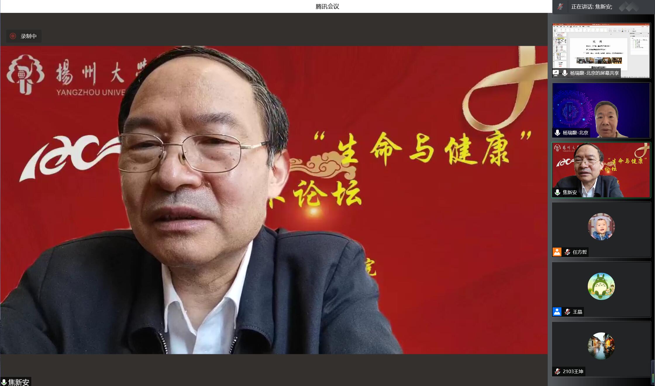 5月7日上午,军事科学院军事医学研究院杨瑞馥研究员、中科院上海巴斯德研究所张晓明研究员应邀参加扬州大学120周年校庆“生命与健康”高端学术论坛,为我院师生做了题为“鼠疫防控:践行one health理念的典范”和“肝脏肿瘤微环境的时空单细胞研究”的专题报告,校党委焦新安书记主持报告会。