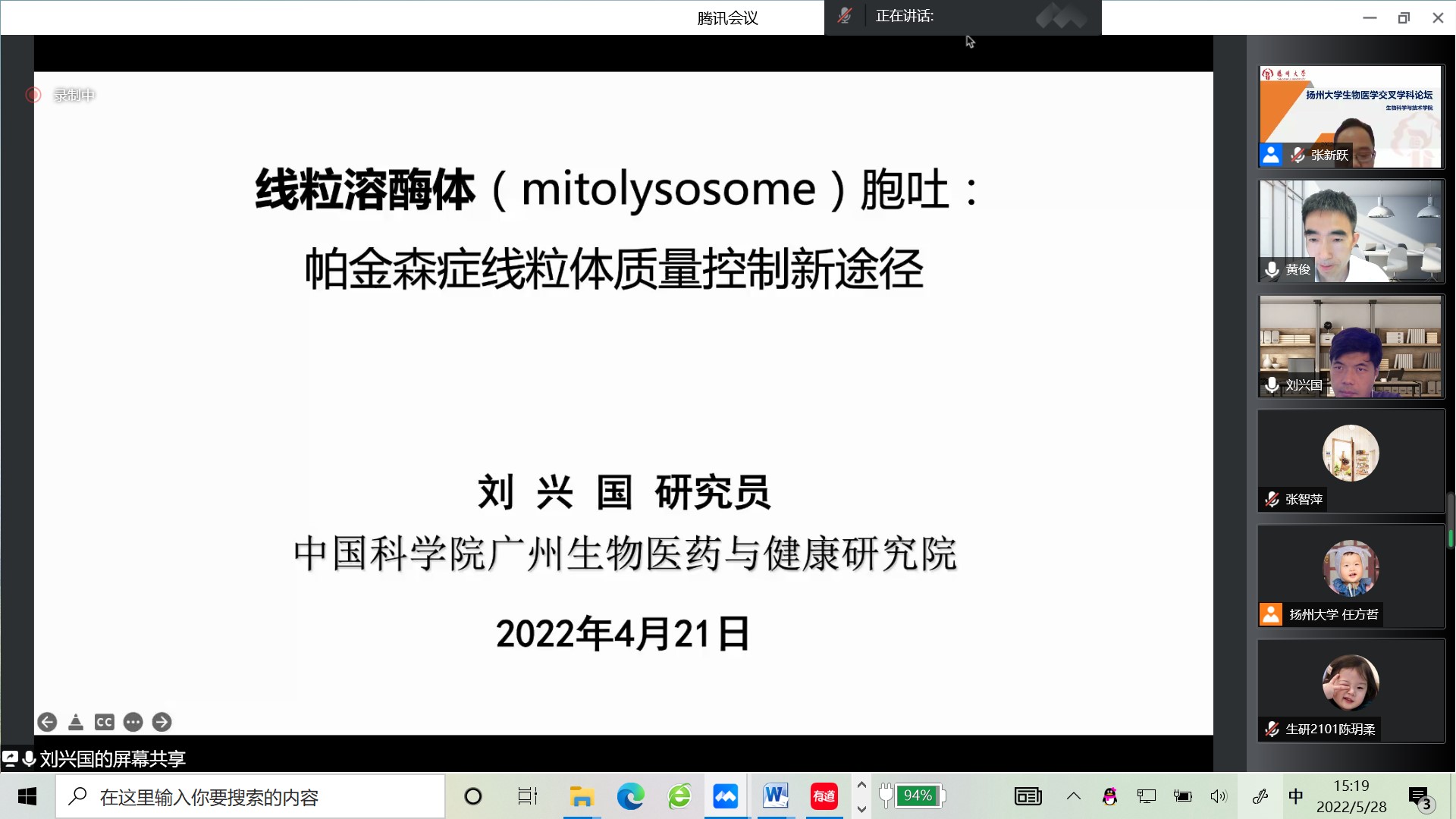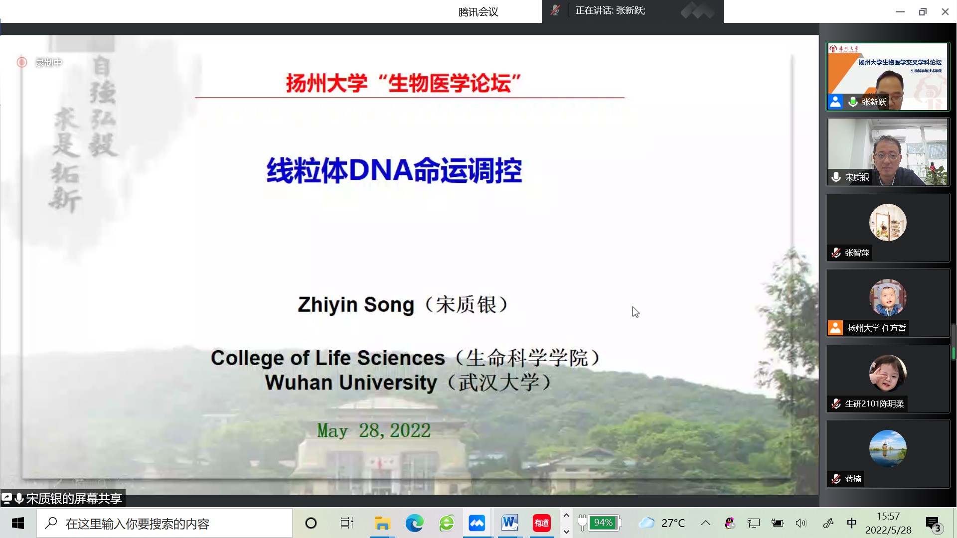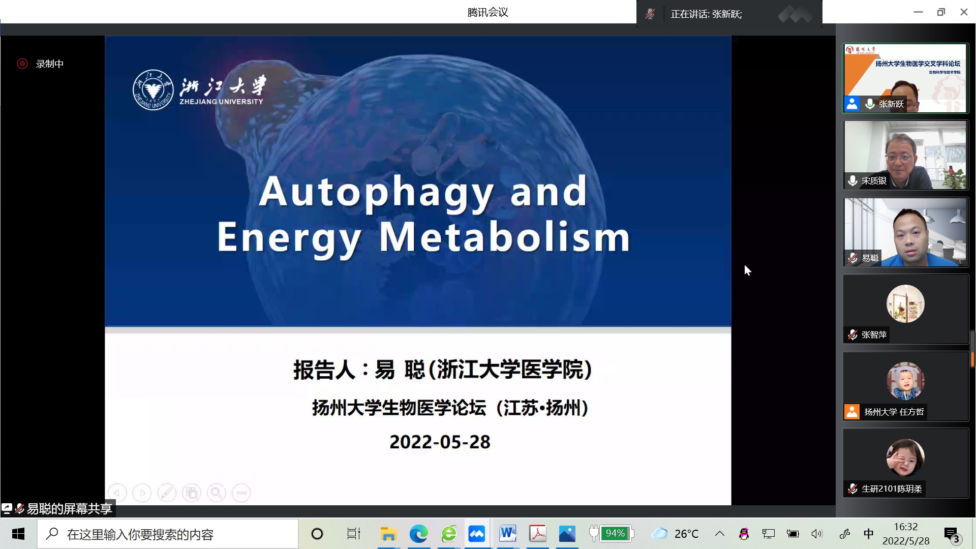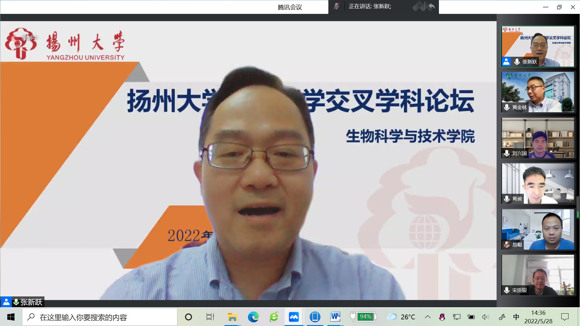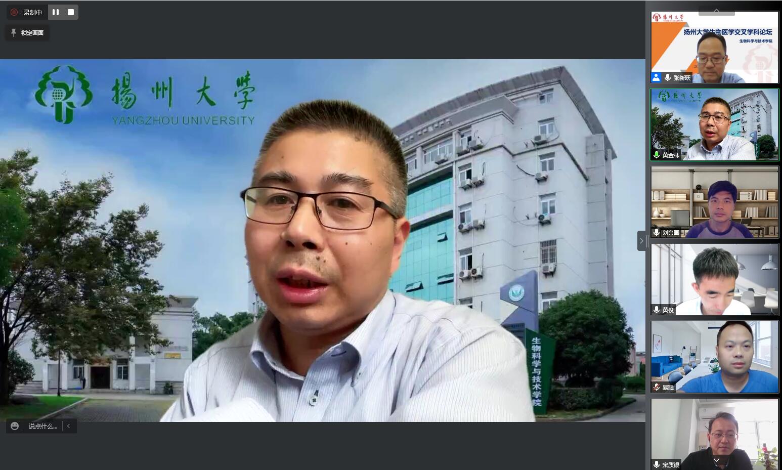 2022年5月28日下午,我院举办扬州大学120周年校庆高端学术活动--“生物医学”交叉学科论坛。会议邀请到了浙江大学生命科学研究院副院长黄俊教授、中国科学院广州生物医药与健康研究院刘兴国研究员、武汉大学生命科学学院宋质银教授、浙江大学医学院易聪教授作学术报告,本次会议采用“线上”模式,由我院张新跃教授主持,200余名师生参加了活动。