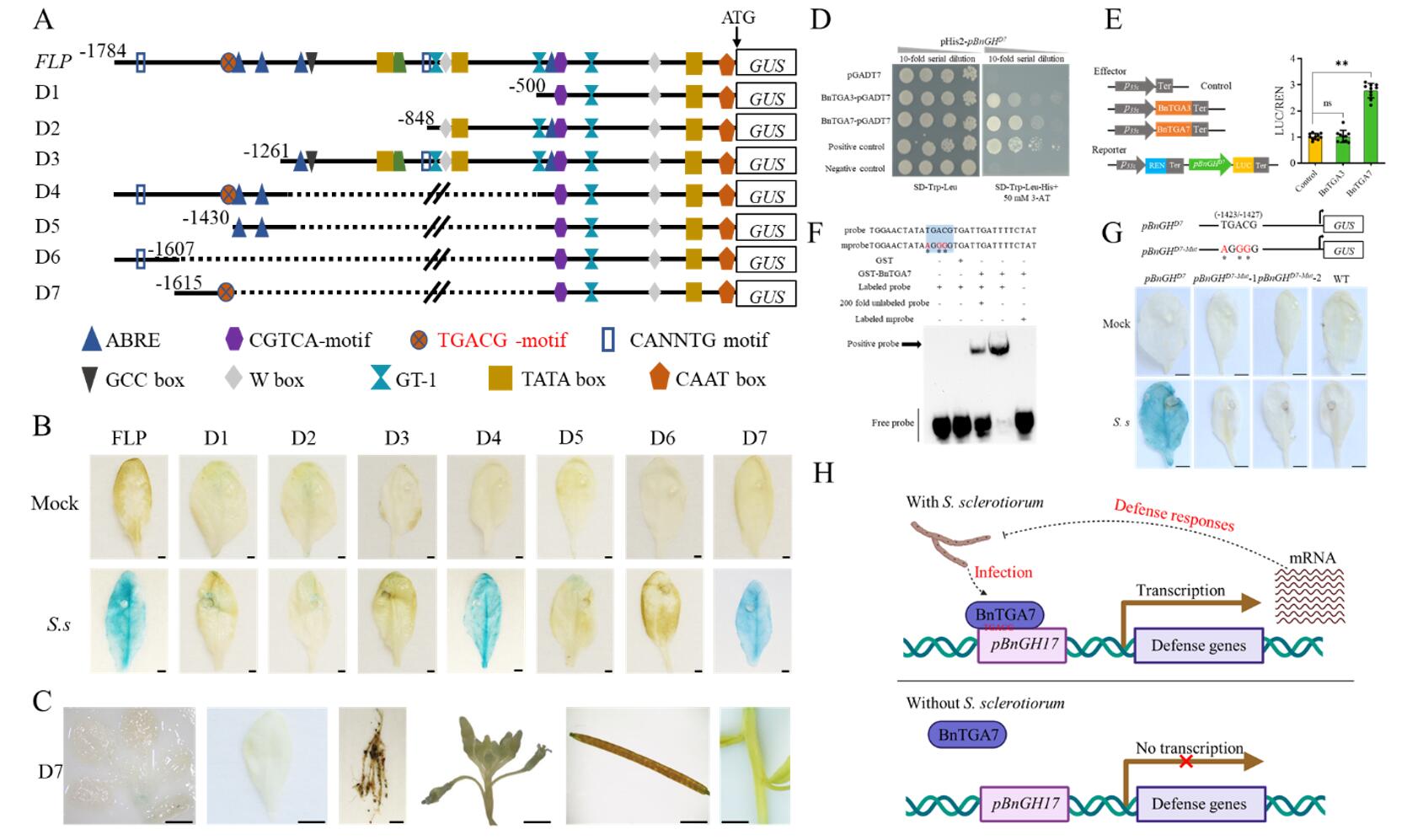 该研究利用转录组测序数据筛选出油菜中6个受核盘菌强烈诱导表达的基因,其中BnGH17基因在正常生长的油菜各器官(除根)中表达量极低,且在非生物胁迫(冷、热、盐、PEG)和激素(茉莉酸甲脂、水杨酸、乙烯利)处理下未显著诱导表达。随后该研究克隆了BnGH17启动子(pBnGH17),利用GUS报告系统发现该启动子活性与BnGH17表达模式一致。进一步通过启动子截短实验发现pBnGH17的-1615至-1427区域是响应核盘菌侵染的核心区域。截短后的启动子pBnGH17D7在根中不再表达,但仍受到核盘菌侵染的强烈诱导。通过酵母单杂交,双荧光素酶实验及凝胶阻滞电泳实验发现转录因子BnTGA7可以在核盘菌侵染时与pBnGH17D7的TGACG-motif直接结合进而激活其转录,同时也发现TGACG-motif突变后pBnGH17D7不再响应核盘菌的侵染,表明TGACG-motif是该启动子响应核盘菌侵染的核心顺式作用元件。