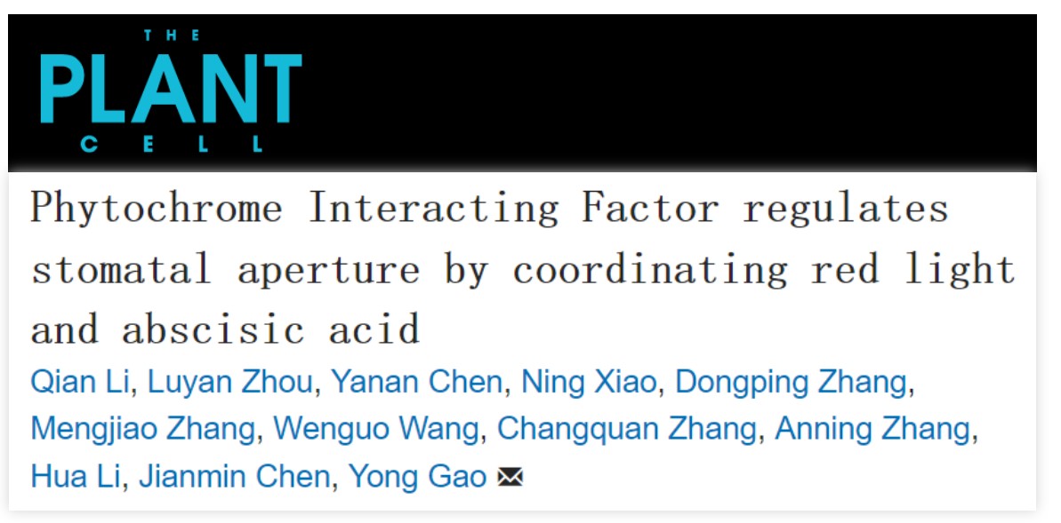 近日,植物科学期刊《The Plant Cell》在线发表了我院高勇教授课题组最新研究成果“Phytochrome Interacting Factor Regulates Stomatal Aperture by Coordinating Red Light and Abscisic Acid”,揭示光敏色素互作因子(PIFs)介导的红光调控气孔开度的新机制。